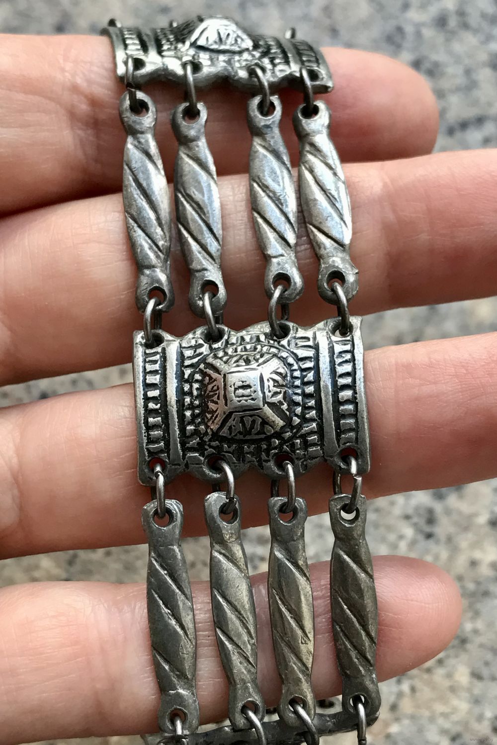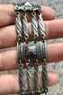 Браслет унисекс из металла серебристого тона (на внутренней стороне есть незначительные потёртости). Длина 19см., высота 2,4см. Застёжка не родная. Тяжёленький.