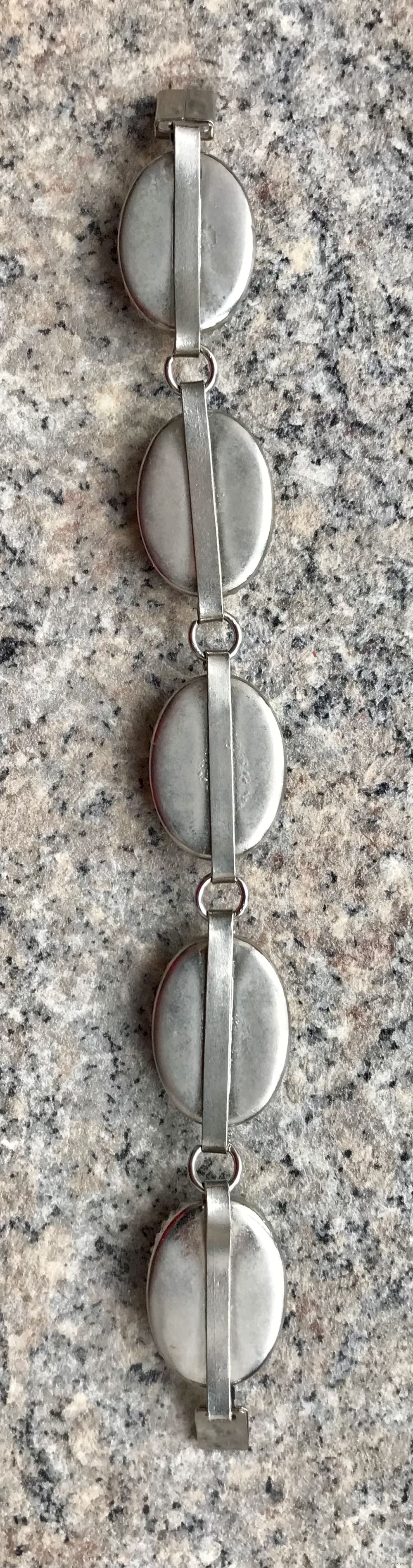 Винтажный комплект с основой из металла серебристого тона и вставок из нат. камня (скорее всего оникс). Длина браслета 19см., длина звена 3,2см., размер вставки 2,5х1,8см. Диаметр броши 3см., диаметр вставки 2см. Состояние хорошее.