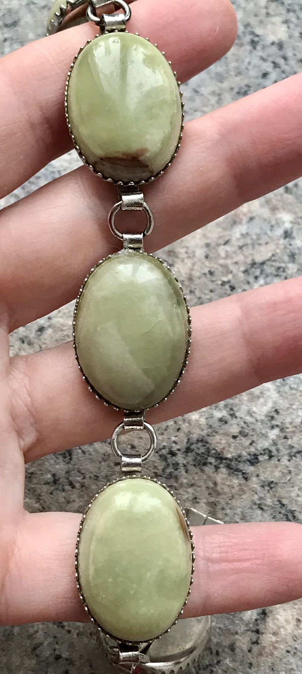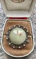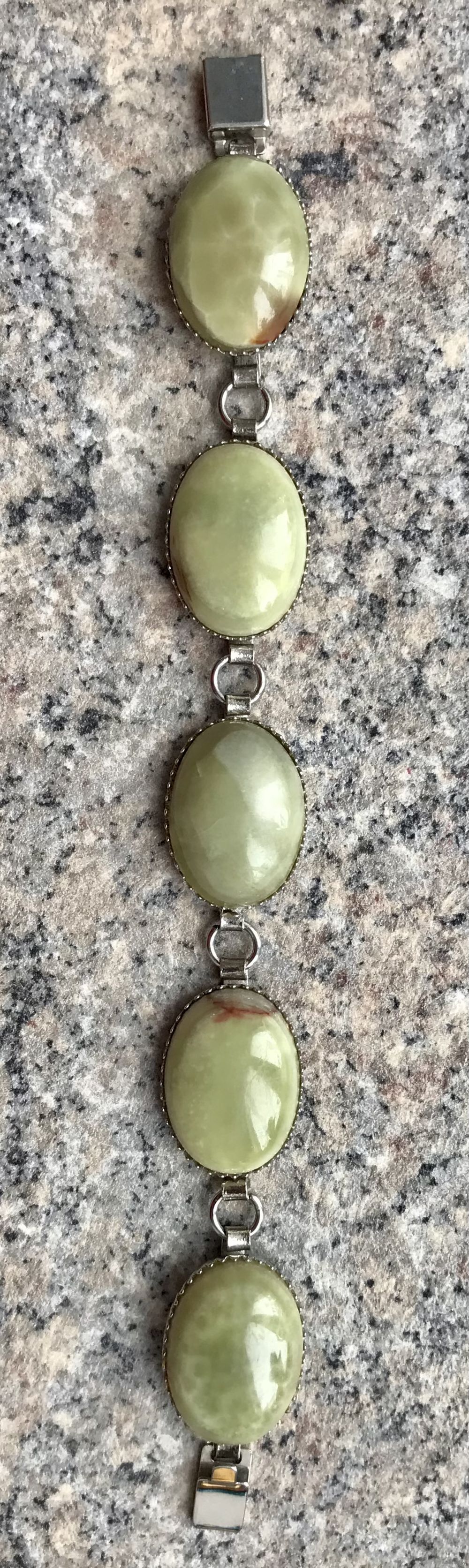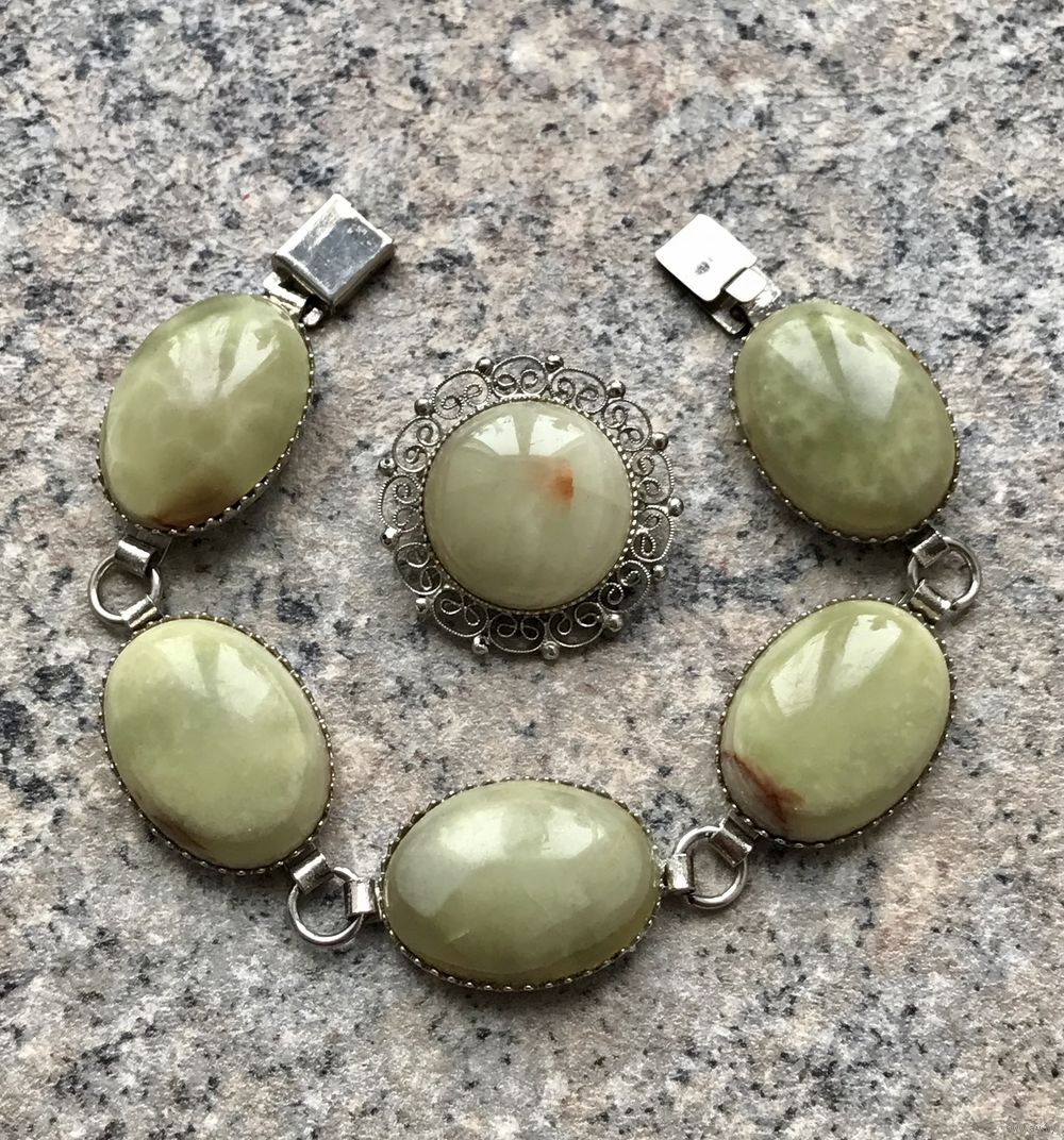 Винтажный комплект с основой из металла серебристого тона и вставок из нат. камня (скорее всего оникс). Длина браслета 19см., длина звена 3,2см., размер вставки 2,5х1,8см. Диаметр броши 3см., диаметр вставки 2см. Состояние хорошее.