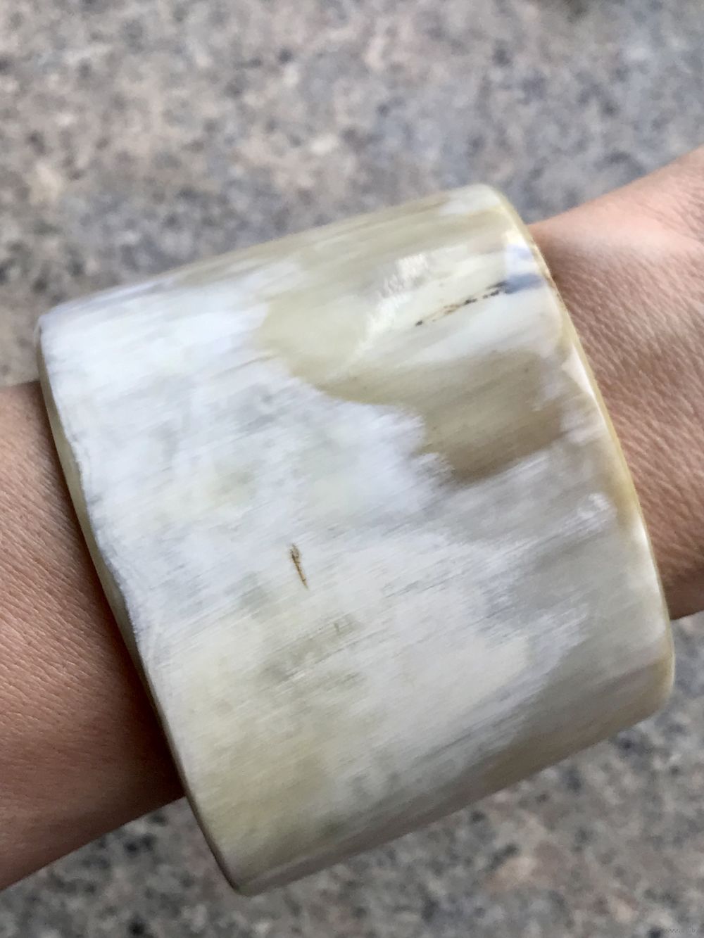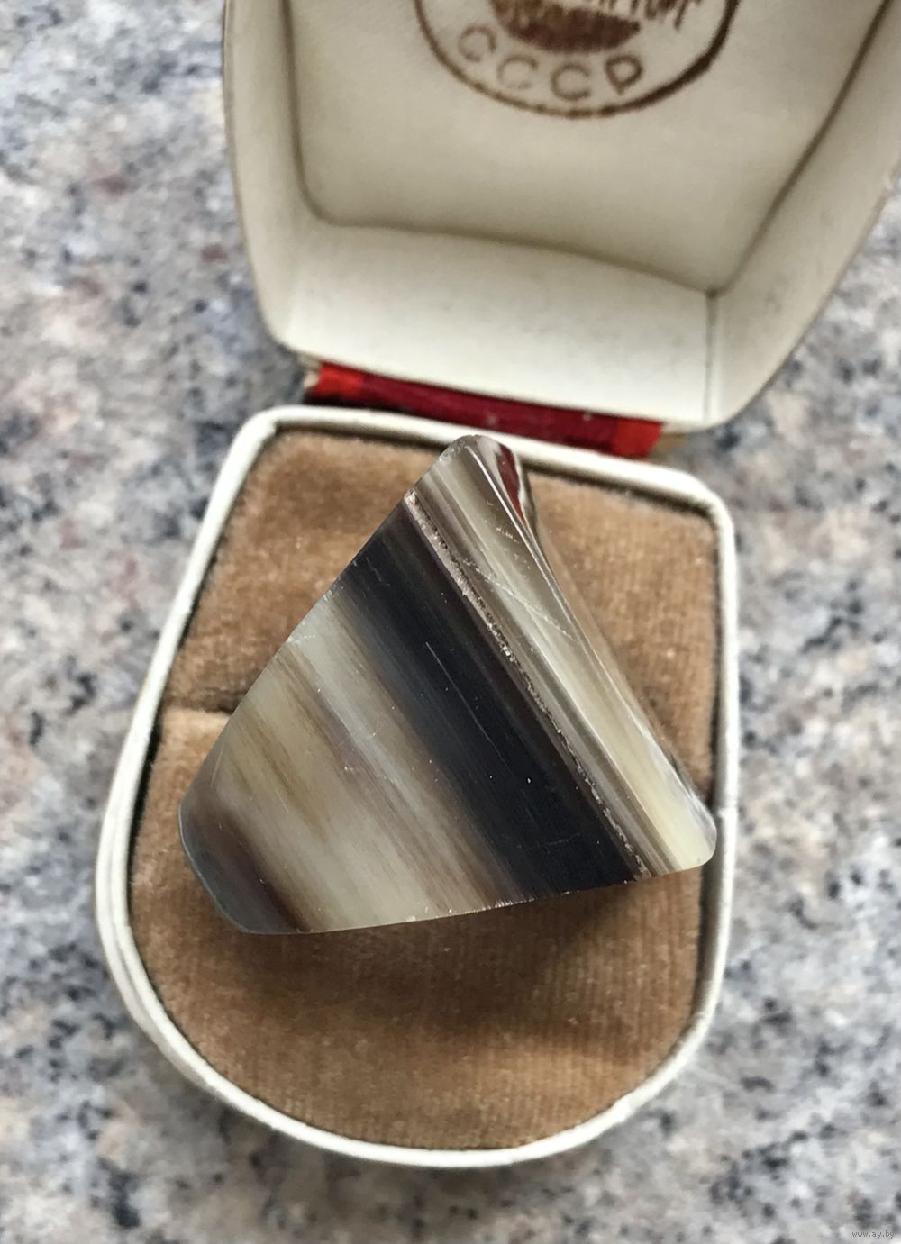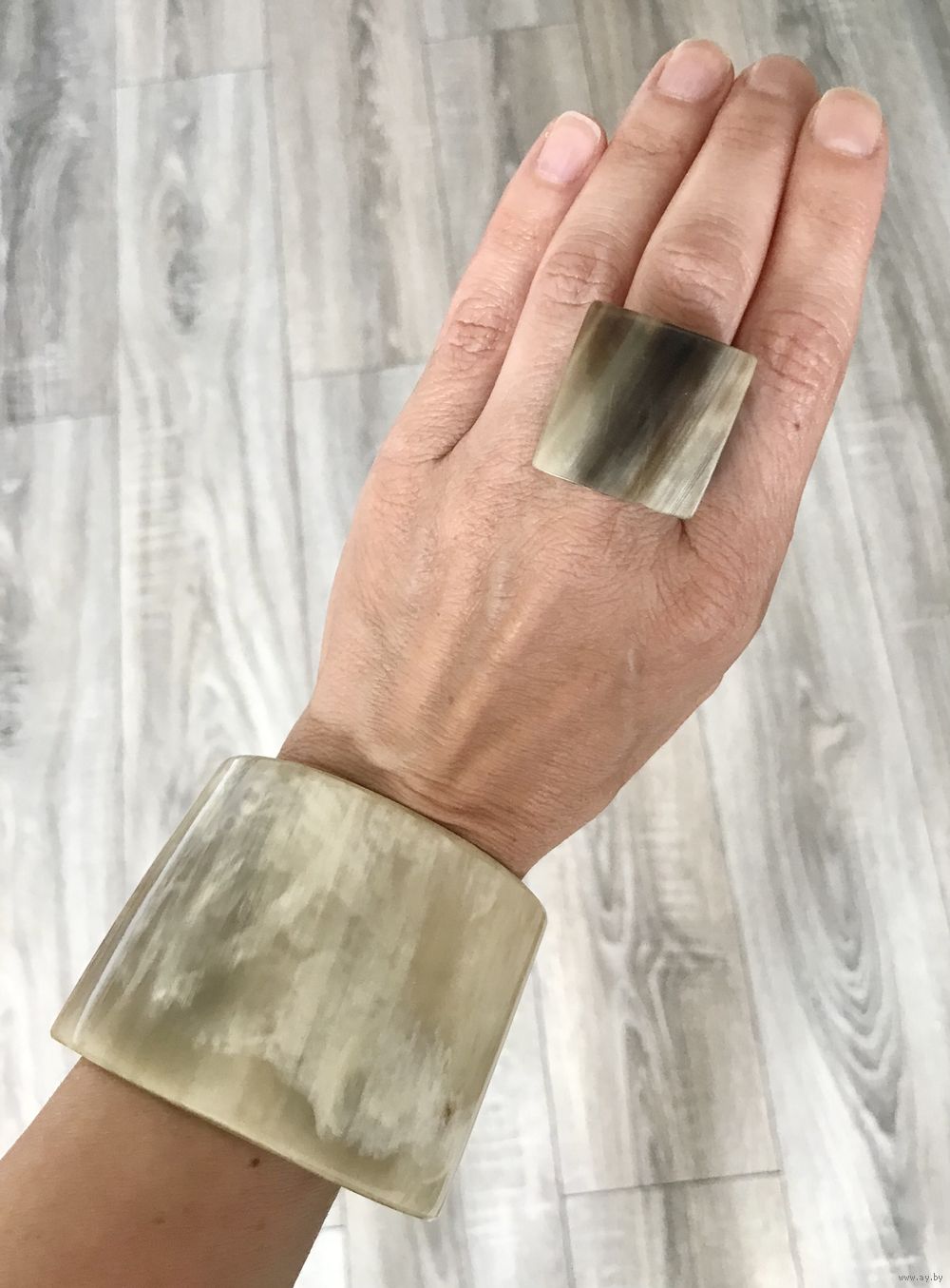 Крупный комплект из рога. Высота браслета 6см., вн. диаметр с одной стороны 6,5см., с другой 7,5см., размер лицевой части кольца 2,7см., размер 18-18,5 (на шинке с обратной стороны есть трещина, но она не сквозная).