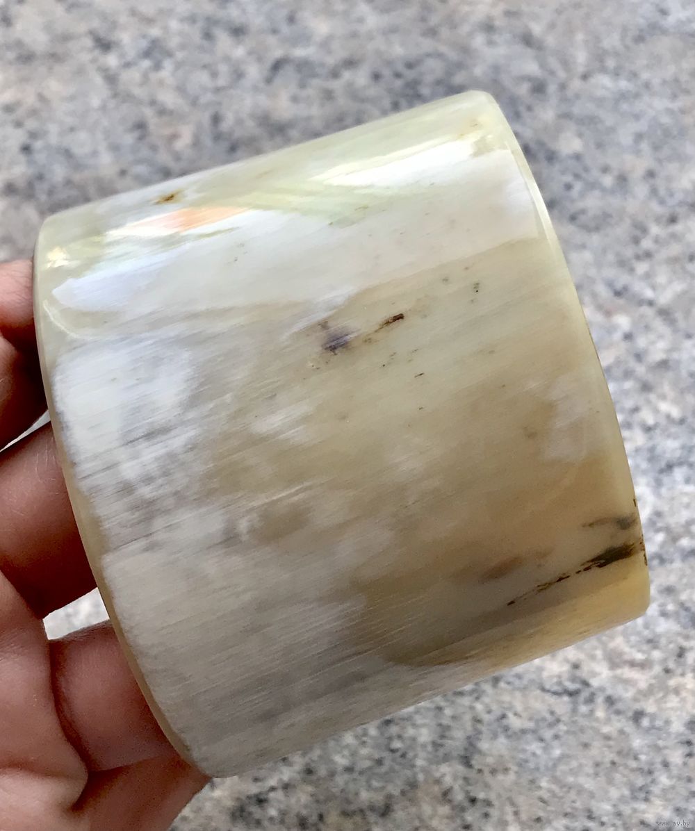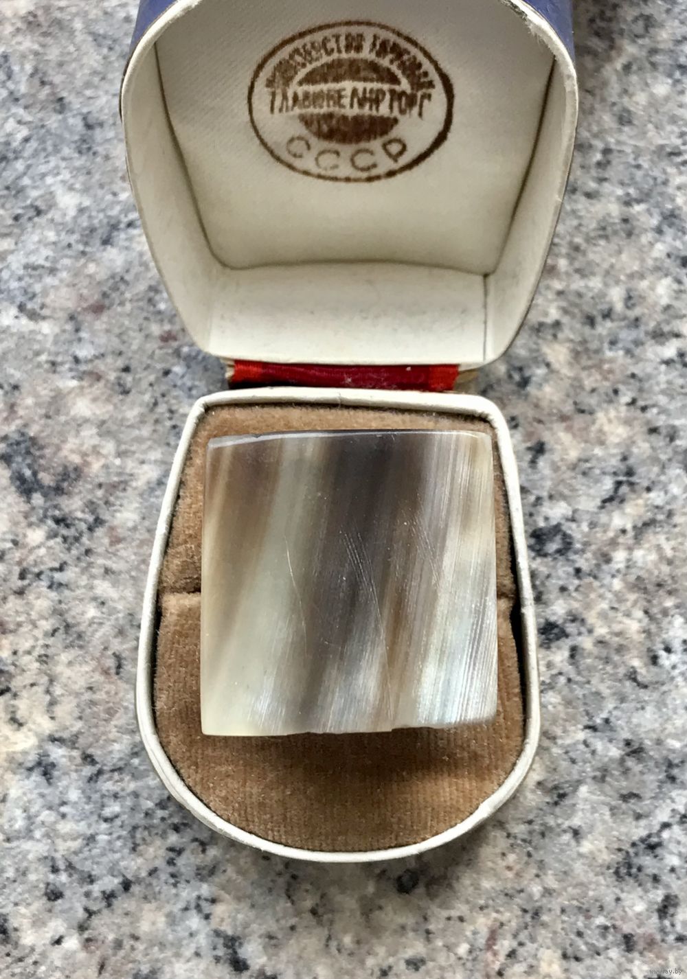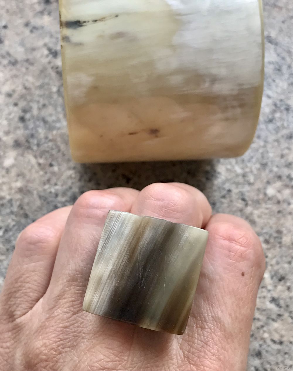 Крупный комплект из рога. Высота браслета 6см., вн. диаметр с одной стороны 6,5см., с другой 7,5см., размер лицевой части кольца 2,7см., размер 18-18,5 (на шинке с обратной стороны есть трещина, но она не сквозная).