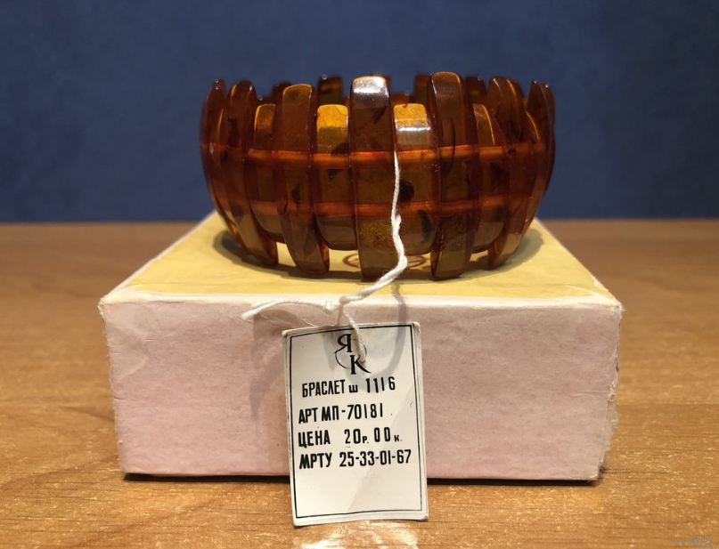 Состояние на фото, состояние оценивайте самостоятельно.Браслет из янтаря на резинке, резинка от времени растянулась, ослаблена. Третье фото точно такой же браслет но с биркой, для понимания временного периода.