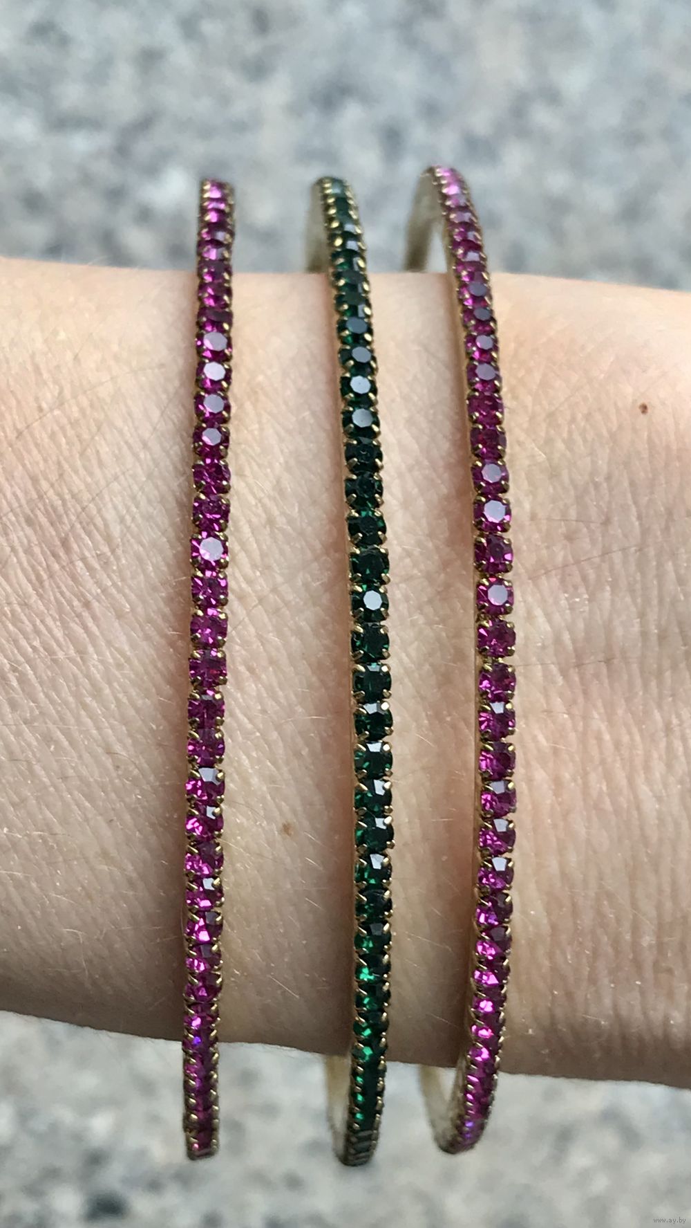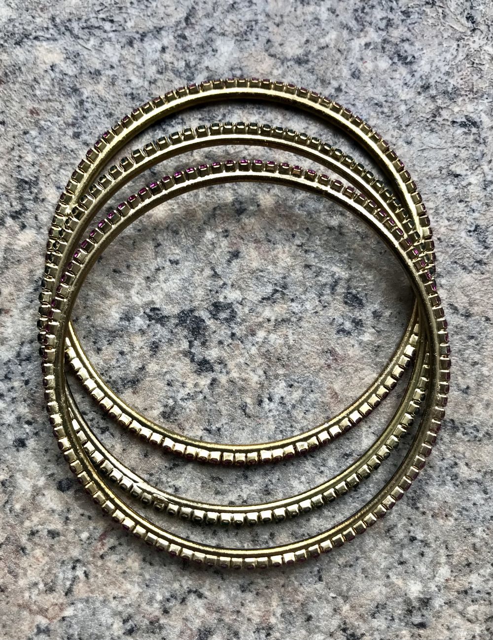 Лот из трёх браслетов с основой из металла золотистого тона, вставки кристаллы. Вн. диаметр каждого 6,2см., высота 0,2см. Неразъёмные. Состояние хорошее.
