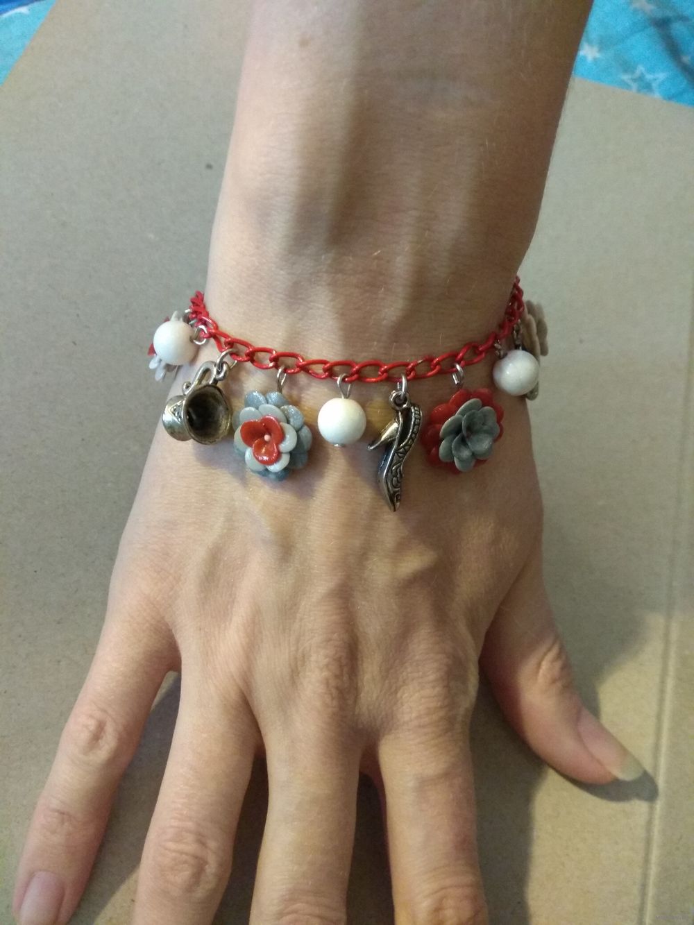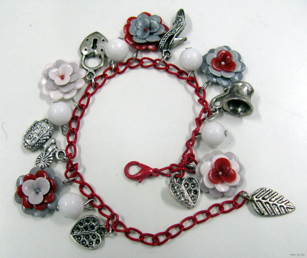 Цветочки браслета из полимерной глины. Камушки - белый опал (кахолонг).