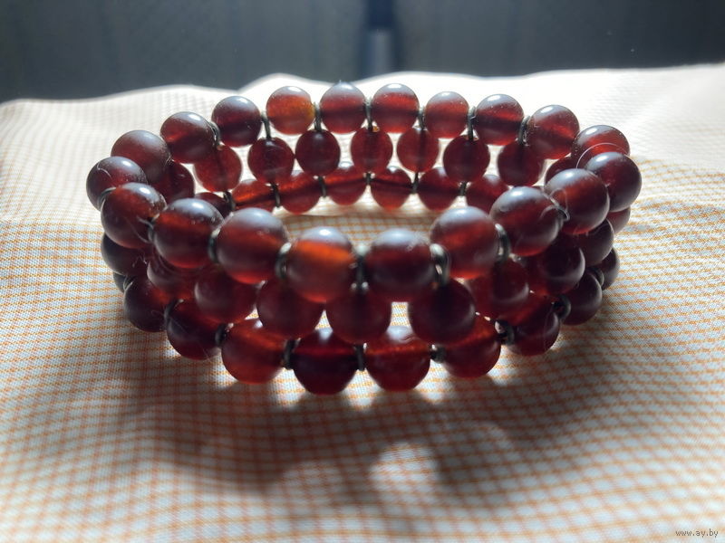 /245/ Калининградский янтарный комбинат. Вес 19 гр, бусины 7 мм, длина нити 17 см. Бусины нанизаны на резинку коричневую тонкую в 2 сложения. Мое запястье 16 см, сидит без растягивания резинки. Этикетка от этого браслета.