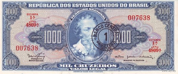 Бразилия у крузеиро на 1000 крузеиро образца 1967 года UNC p187b
