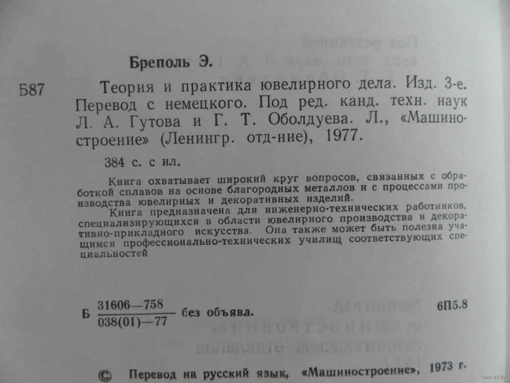 Книга охватывает широкий круг вопросов, связанных с обработкой сплавов на основе благородных металлов и с процессами производства ювелирных и декоративных изделий. В ней рассмотрены механические характеристики и физико-химические свойства чистых металов и сплавов, вопросы металловедения, литейного производства, ковки, термической обработки, пайки, обработки резанием сплавов благородных металлов. Приведены основы пробирного анализа драгоценных сплавов. Даны описания конструкций и способов производства оправ, замков и других элементов ювелирных украшений. Для инженерно-технических работников, специализирующихся в области ювелирного производства и декоративно-прикладного искусства. В книге 335 рисунков.