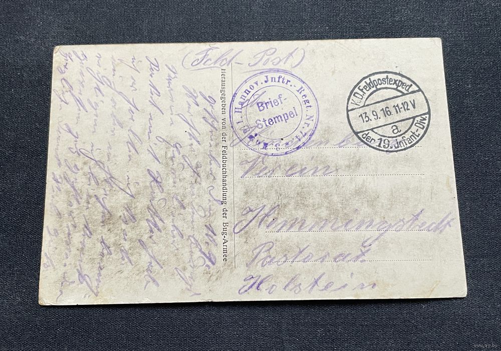 "Выдадзена палявой кніжнай крамай арміі "Буг". Гановерскі пяхотны полк. Паштовы штэмпель. Каралеўская дывізійная палявая паштовая экспедыцыя 13 верасня 1916 года, 11-12 гадзін вечара, пры 19-й пяхотнай дывізіі".