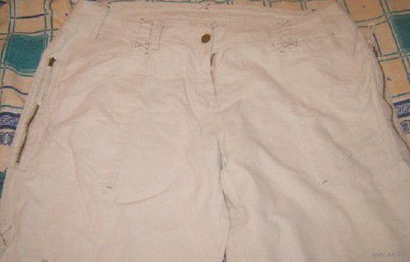 Фирменные красивые бриджи. Интересная модель, много карманов (на замке и кнопках). Размер 54-56 (маркировка Х6). ПОТ 52см, ПОБ 68см, длина сбоку 90см, посадка спереди 25см, сзади 38см. Состав 55% лен, 45% хлопок. Совершенно новые, оказались малы.