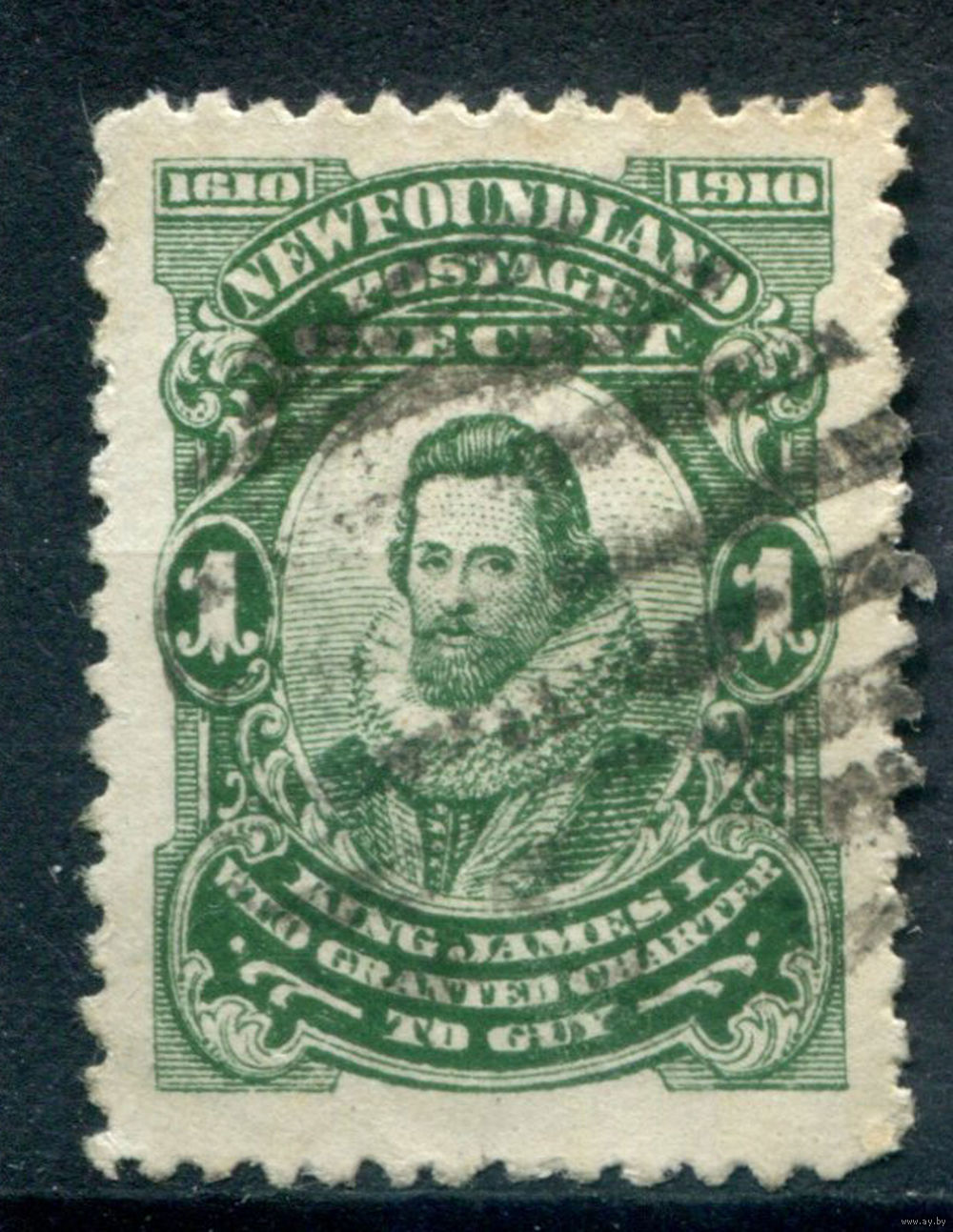 Британские колонии - Ньюфаундленд - 1910г. - король Джеймс I, картина, 300 лет первой британской колонии - Ньюфаундленд, перфорация 12:11, 1 с - 1 марка - гашёная [Mi 68]. #3-WB-102-A-1