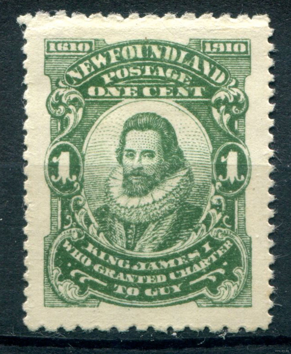 Британские колонии - Ньюфаундленд - 1910г. - король Джеймс I, картина, 300 лет первой британской колонии - Ньюфаундленд, перфорация 12:14, 1 с - 1 марка - MH [Mi 68]. #3-WB-92-A-1