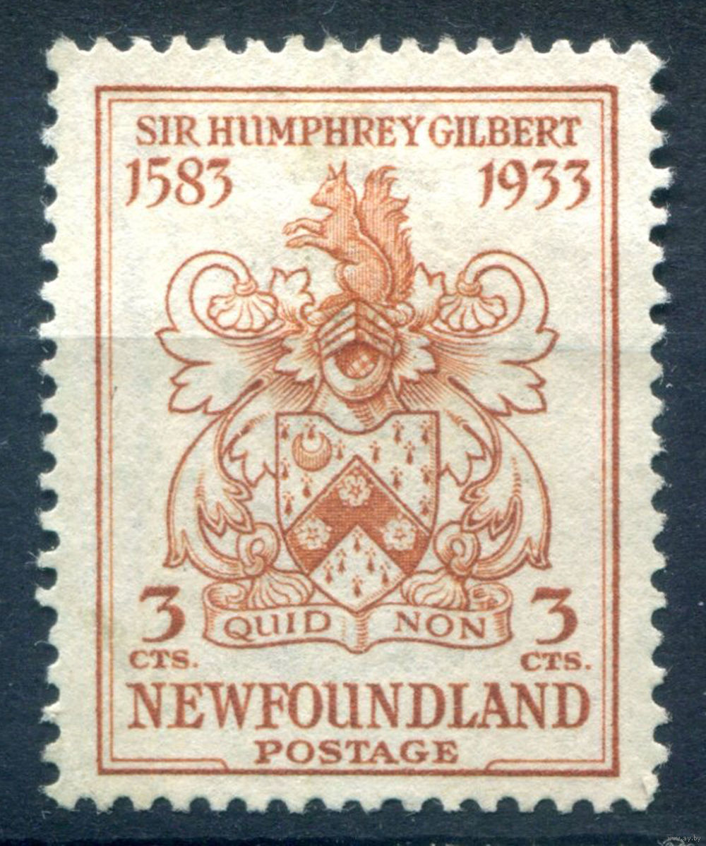 Британские колонии - Ньюфаундленд - 1933г. - герб, 350 лет перехода владения Ньюфаундлендом Хемфри Гилберту, 3 с - 1 марка - чистая, без клея с наклейкой [Mi 202]. #3-WB-82-A-1