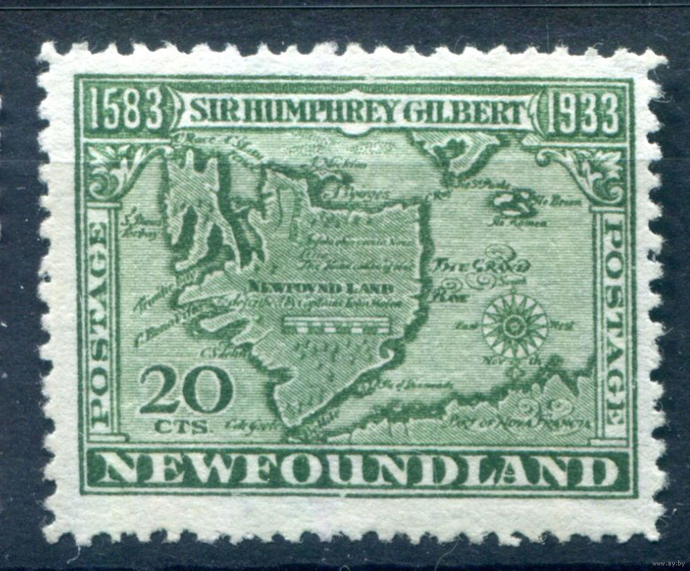 Британские колонии - Ньюфаундленд - 1933г. - карта Ньюфаундленда, 350 лет перехода владения Ньюфаундлендом Хемфри Гилберту, 20 с - 1 марка - чистая, без клея с наклейкой [Mi 211]. #3-WB-82-A-1