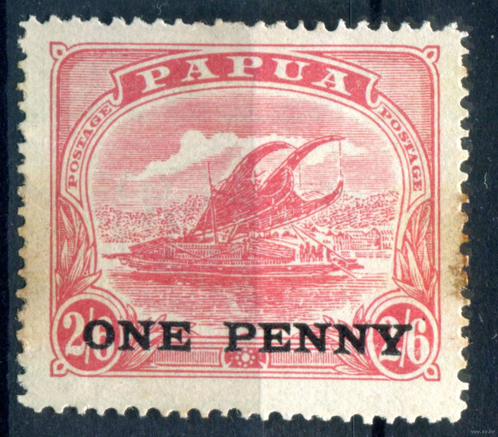Британские колонии - Папуа - 1917г. - лакатой, парусное судно, надпечатка 1 P на 2 6 Sh - 1 марка - MH с жёлтыми пятнами [Mi 68]. #3-WB-82-A-1