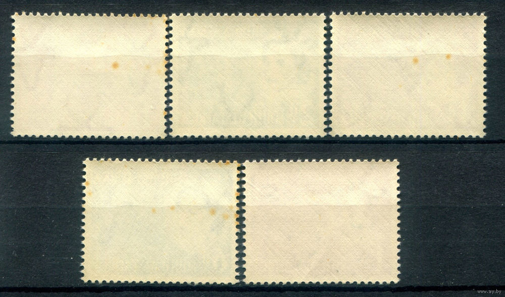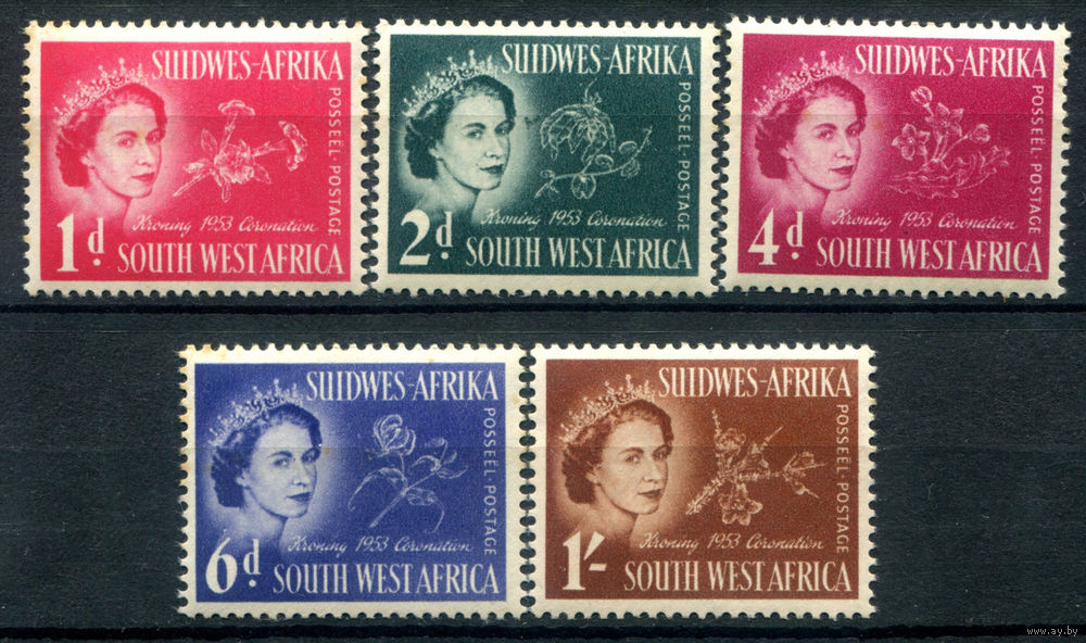 Британские колонии - Юго-Западная Африка - 1953г. - коронация королевы Елизаветы II - 5 марок - полная серия, MNH, 3 марки с маленькими жёлтыми пятнышками на зубчиках перфорации и клее [Mi 274-278]. #2-Bc-130-A-2
