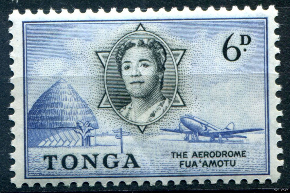 Британский протекторат - Королевство Тонга - 1953г. - ландшафты, архитектура, самолёт, королева Салоте Тупоу III, 6 P - 1 марка - MLH [Mi 107]. #4-B5-106-A-1