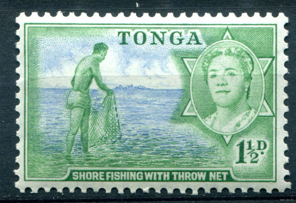 Британский протекторат - Королевство Тонга - 1953г. - ландшафты, рыбак, королева Салоте Тупоу III, 1 1/2 P - 1 марка - MLH [Mi 101]. #4-B5-106-A-1