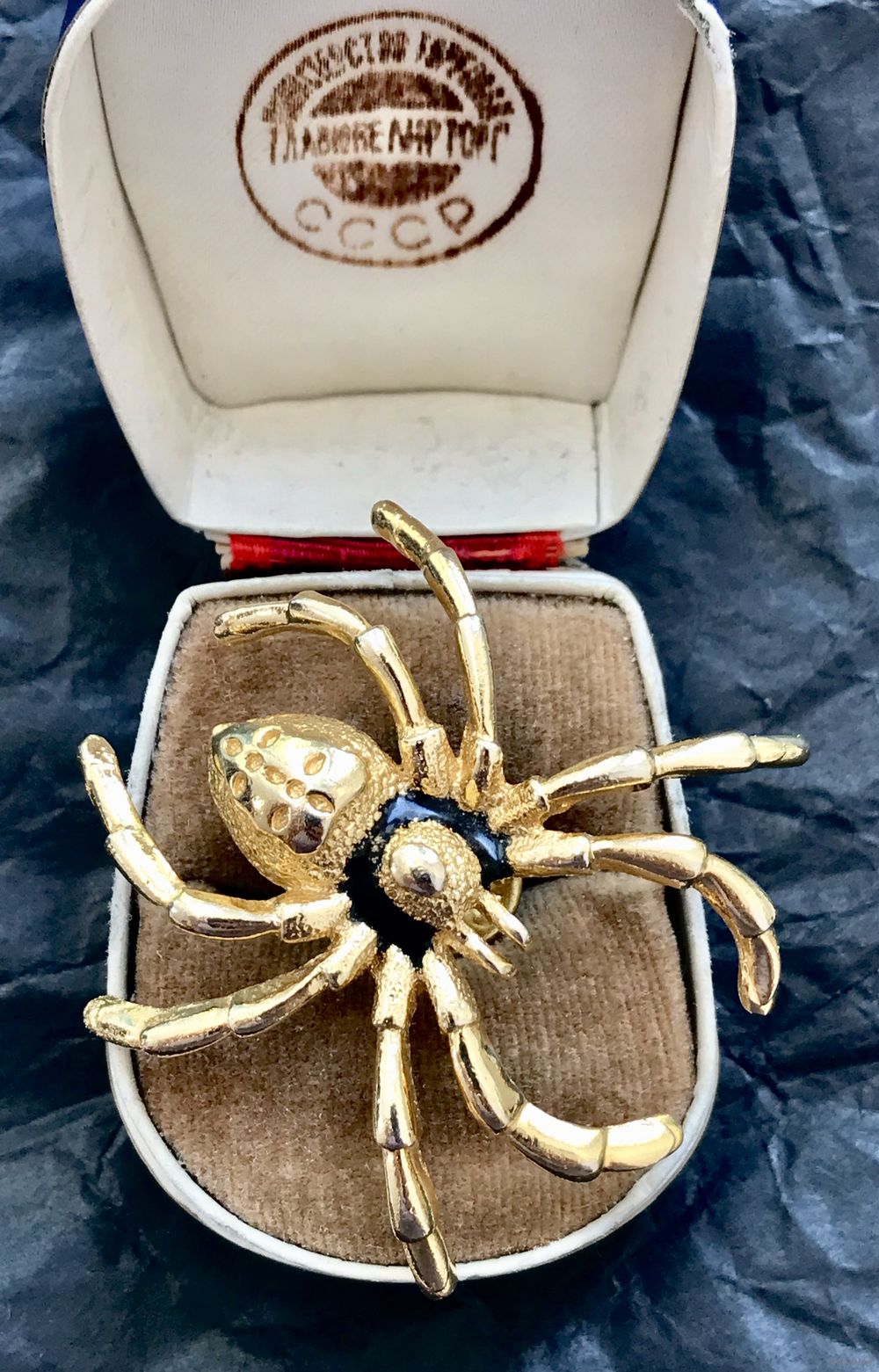 Крупная винтажная брошь-пин в виде паука из металла золотого тона, лицевая сторона украшена эмалью чёрного цвета. Размер броши 4,5х4,5см. Тяжёленькая. Брошь маркирована, но мне не удалось ее атрибутировать. Состояние хорошее.