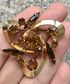Винтажная чешская брошь с основой из латуни с позолотой и вставками из цветного стекла. Размер броши 4х4х4см., на металле местами есть незначительные потёртости позолоты. Общее состояние украшения хорошее.