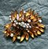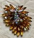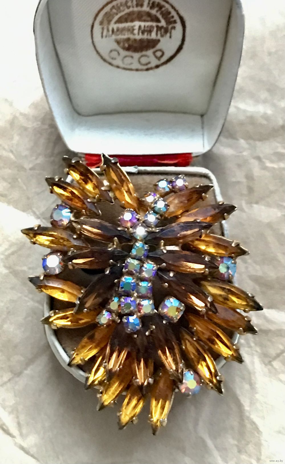 Крупная винтажная чешская брошь с основой из латуни с позолотой, лицевая сторона украшена вставками из цветного стекла и кристаллами с покрытием AB. Размер броши 6х4,5см. Состояние хорошее.