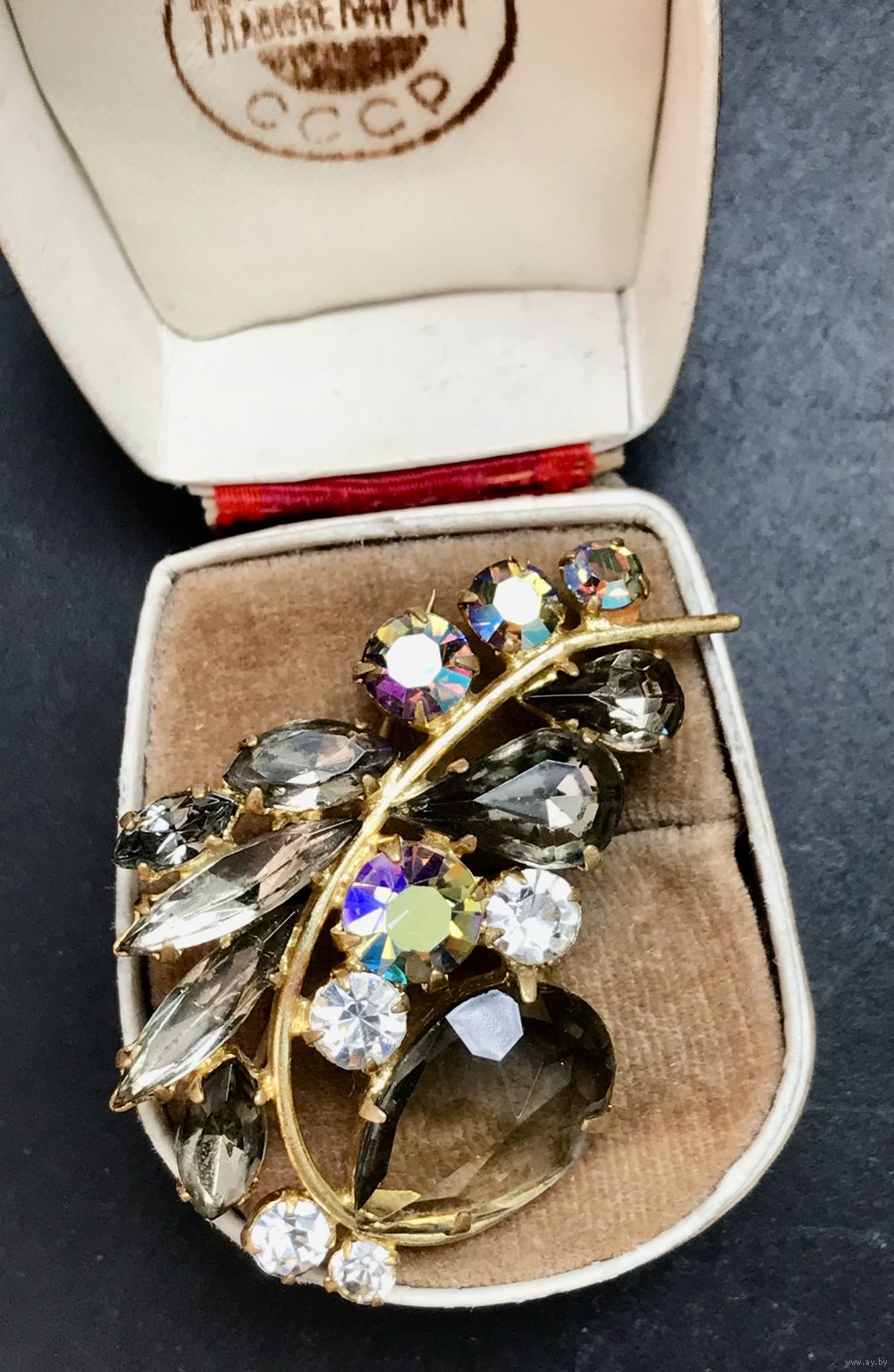 Винтажная чешская брошь с основой из латуни, лицевая сторона украшена вставками из цветного стекла и стекла с покрытием AB. Размер броши 4,7х3,2см. Состояние хорошее.
