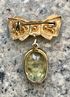 Небольшая винтажная чешская брошь. Основа из металла золотого тона, вставки из стекла. Высота броши 4см., размер вставки в подвеске 2х1,5см., на вставке с обратной стороны имеется небольшая царапинка, на металле местами незначительные потемнения и потёртости. Цена указана с учётом нюансов.