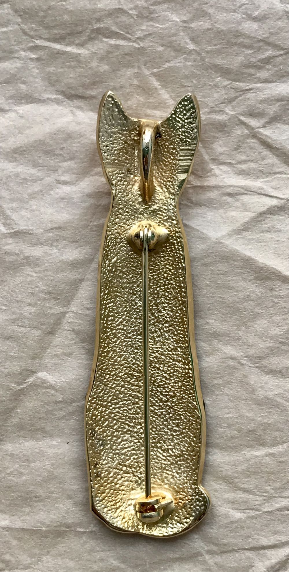 Крупная брошь из металла золотого тона, лицевая сторона покрыта эмалью чёрного цвета. Высота кошки 6,5см. Можно носить как кулон. Состояние хорошее. Тяжёленькая.
