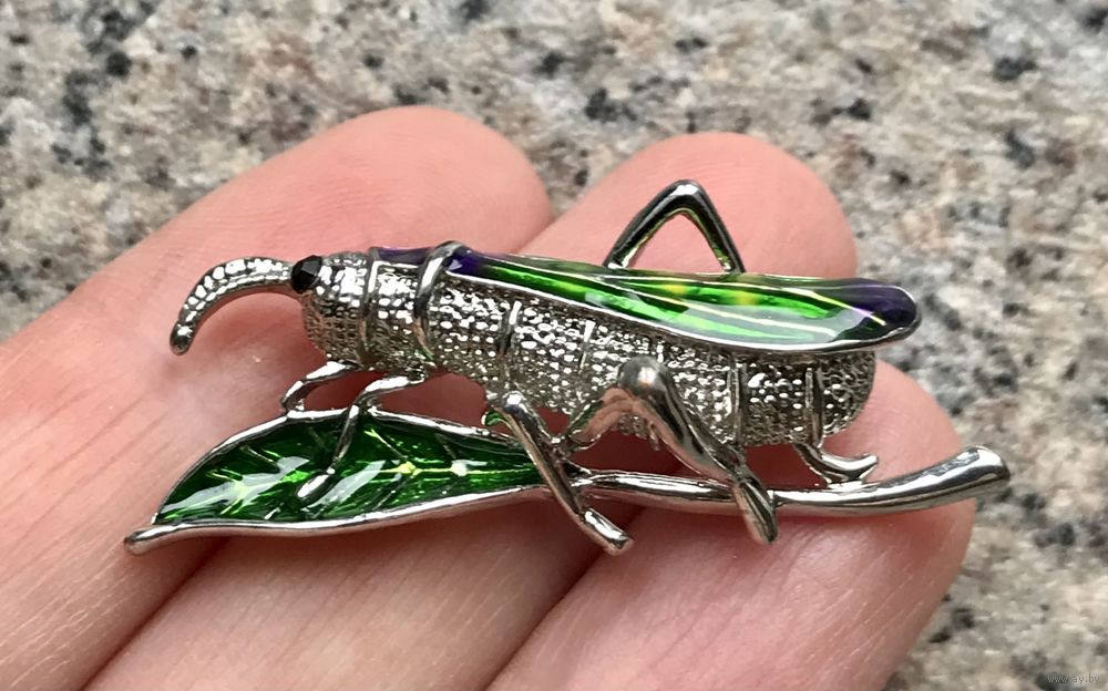 Брошь кузнечик из металла серебристого тона, лицевая сторона покрыта эмалью. Длина 4,5 см., высота~1,5 см. Состояние хорошее.