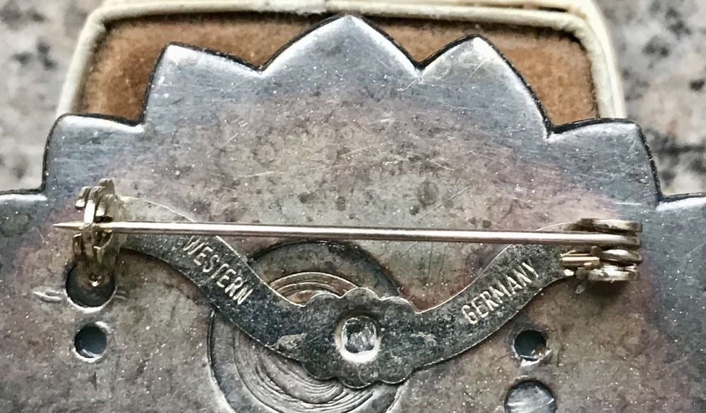 Крупная брошь из металла серебристого тона с лёгкой патиной в виде динозаврика. Брошь лёгкая, т.к.внутри полая. На застёжке стоит маркировка Western Germany. Размер динозаврика 6,2х3,5см.