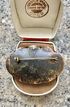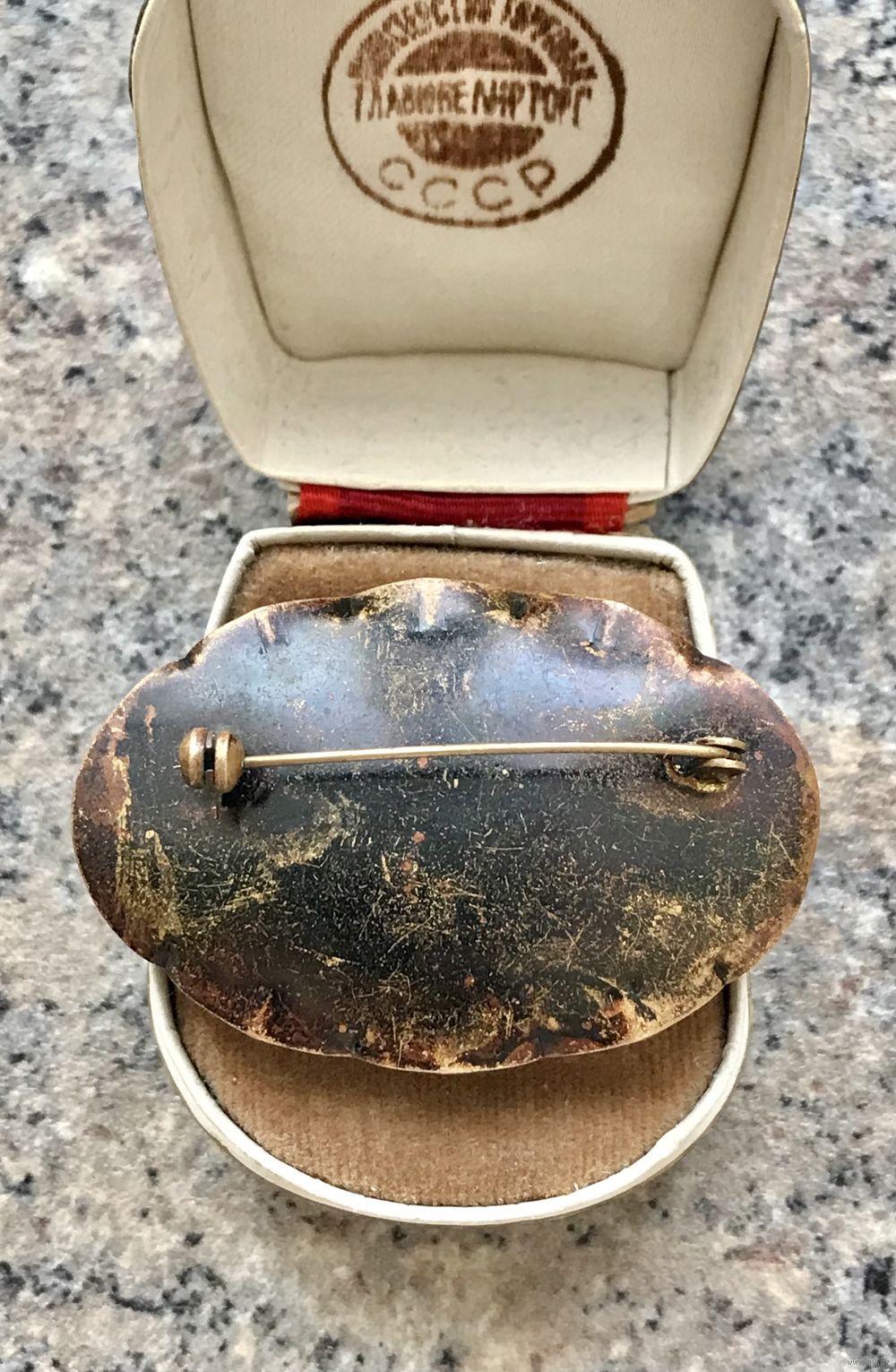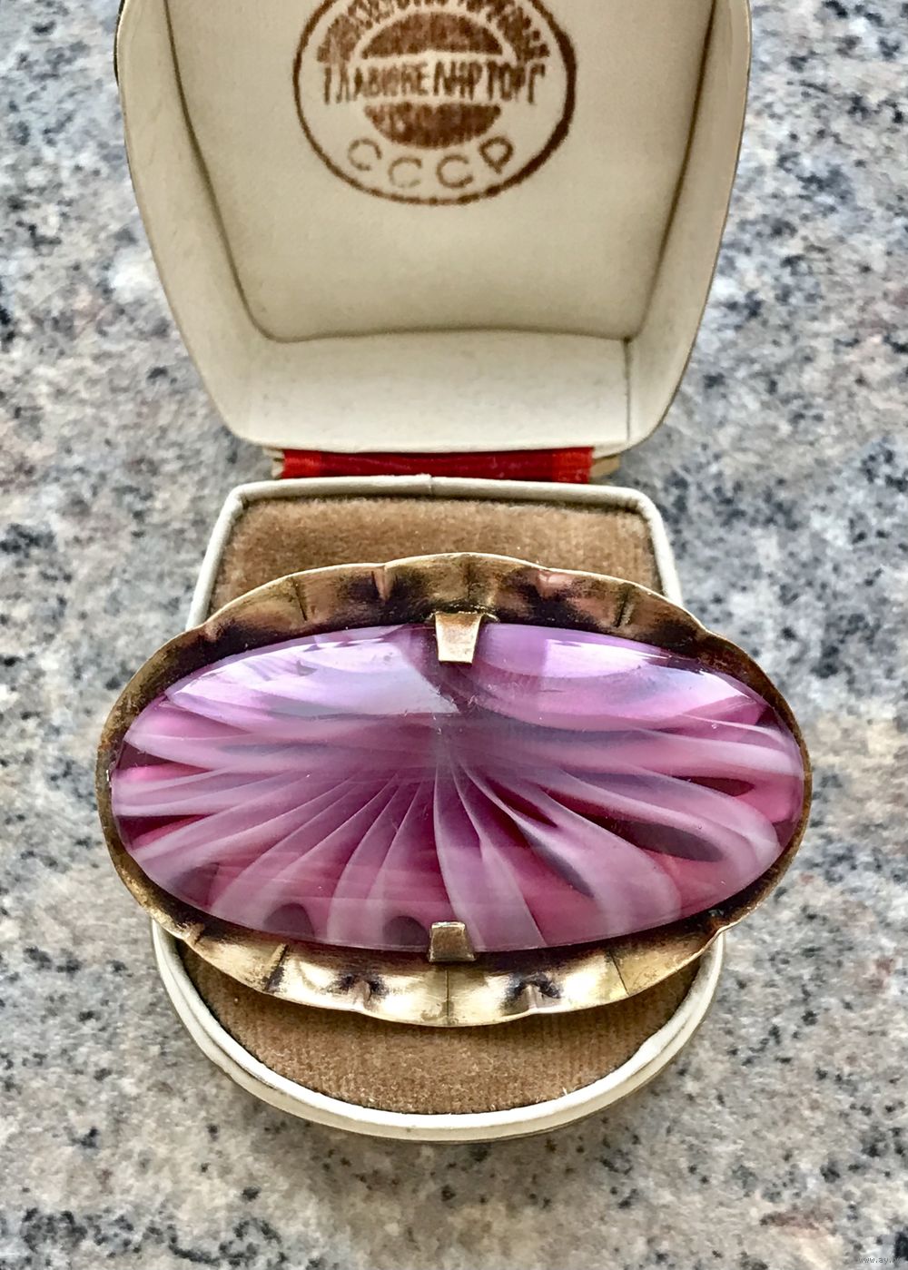 Крупная винтажная брошь. Привезена из Европы. Основа из металла с позолотой, местами покрыта патиной, вставка из художественного стекла. Размер броши 5х3,5см., размер вставки 4,8х2,2см. На вставке имеются незначительные царапинки.