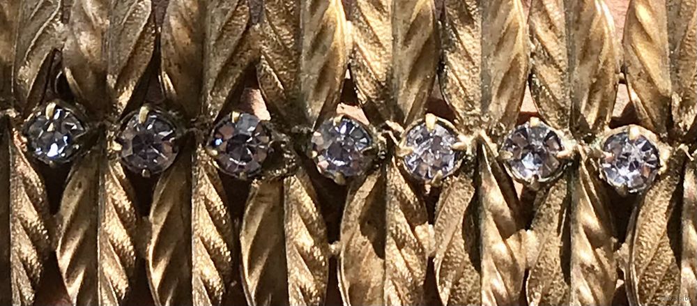 Крупная винтажная брошь с основой из металла золотого тона (от времени металл покрылся благородной патиной) и вставок из кристаллов сиренево-розового цвета. Размер броши 7,4х3см. Состояние хорошее.
