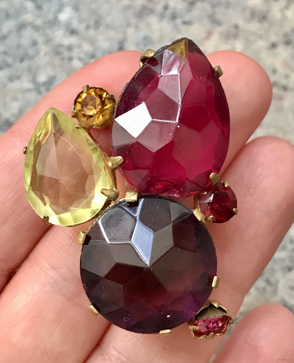 Чешская крупная брошь со вставками из цветного стекла. На одной вставке скол, один элемент со вставкой немного деформирован (эти нюансы учтены в цене). Размер броши 4,5х3см.