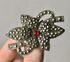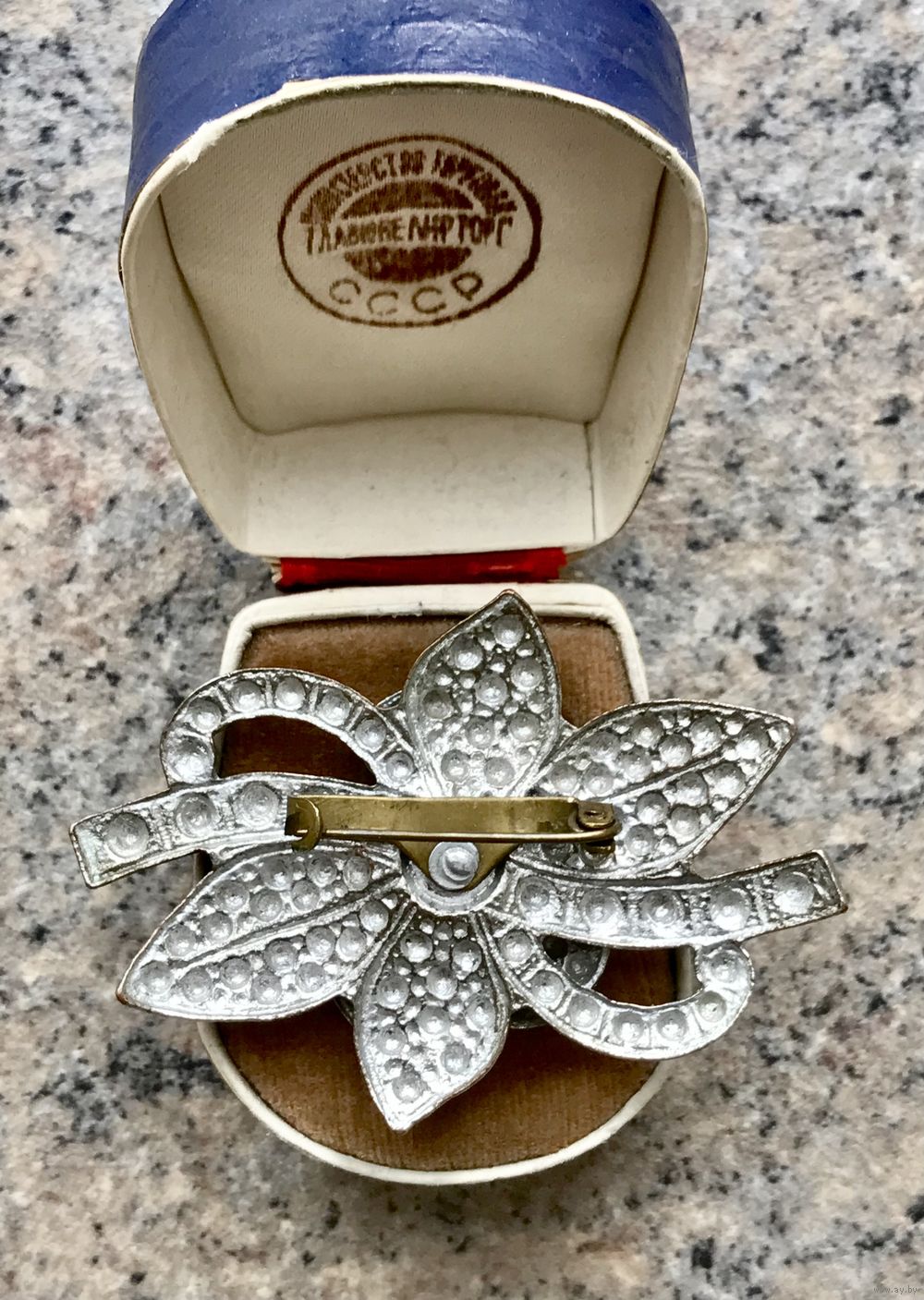 Крупная винтажная брошь из металла серебристого тона (местами есть незначительные потёртости) со вставкой из люцита малинового цвета. Размер броши 6х4,4см. Немного подвижна застёжка. Общее состояние хорошее. Тяжёленькая.
