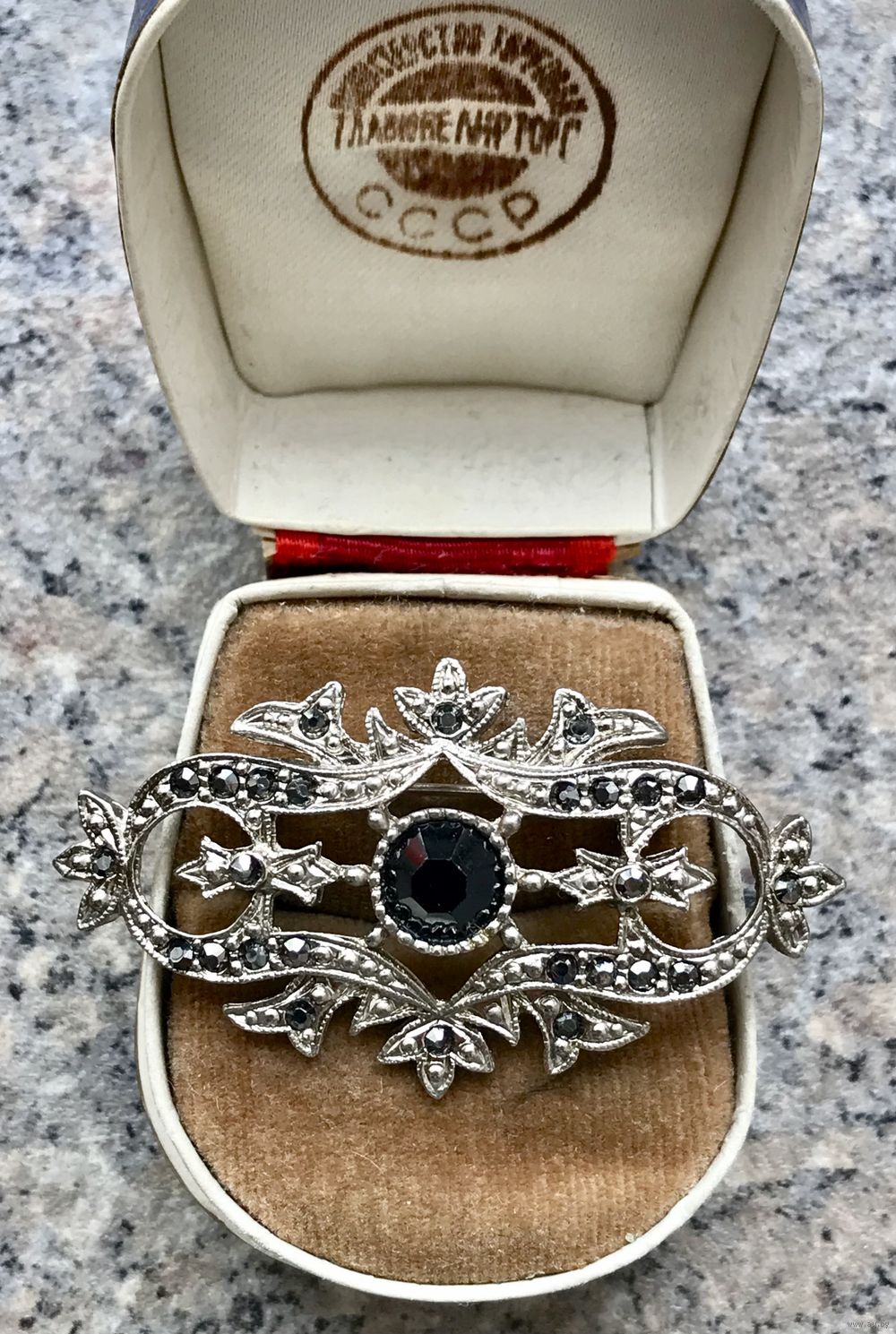Винтажная брошь с основой из металла серебристого тона, вставки стекло и марказиты. Размер броши 5,2х2,9см. Состояние хорошее.