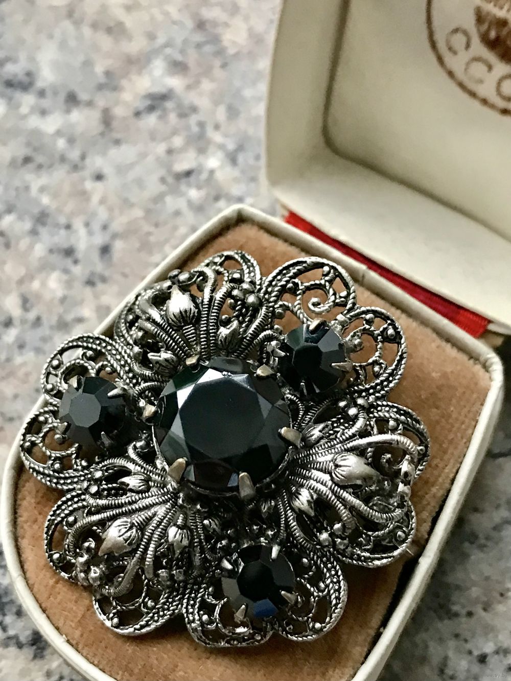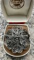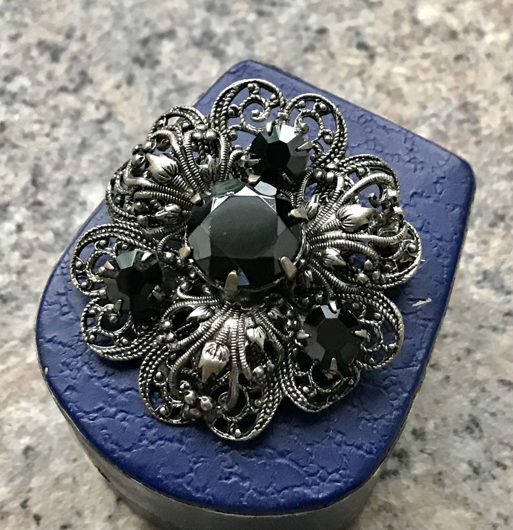 Винтажная чешская брошь с ажурной основой из металла серебристого тона. Вставки из стекла чёрного цвета (на центральной вставке незначительный скол, в носке не заметен, учтено в цене). Диаметр броши 4см.