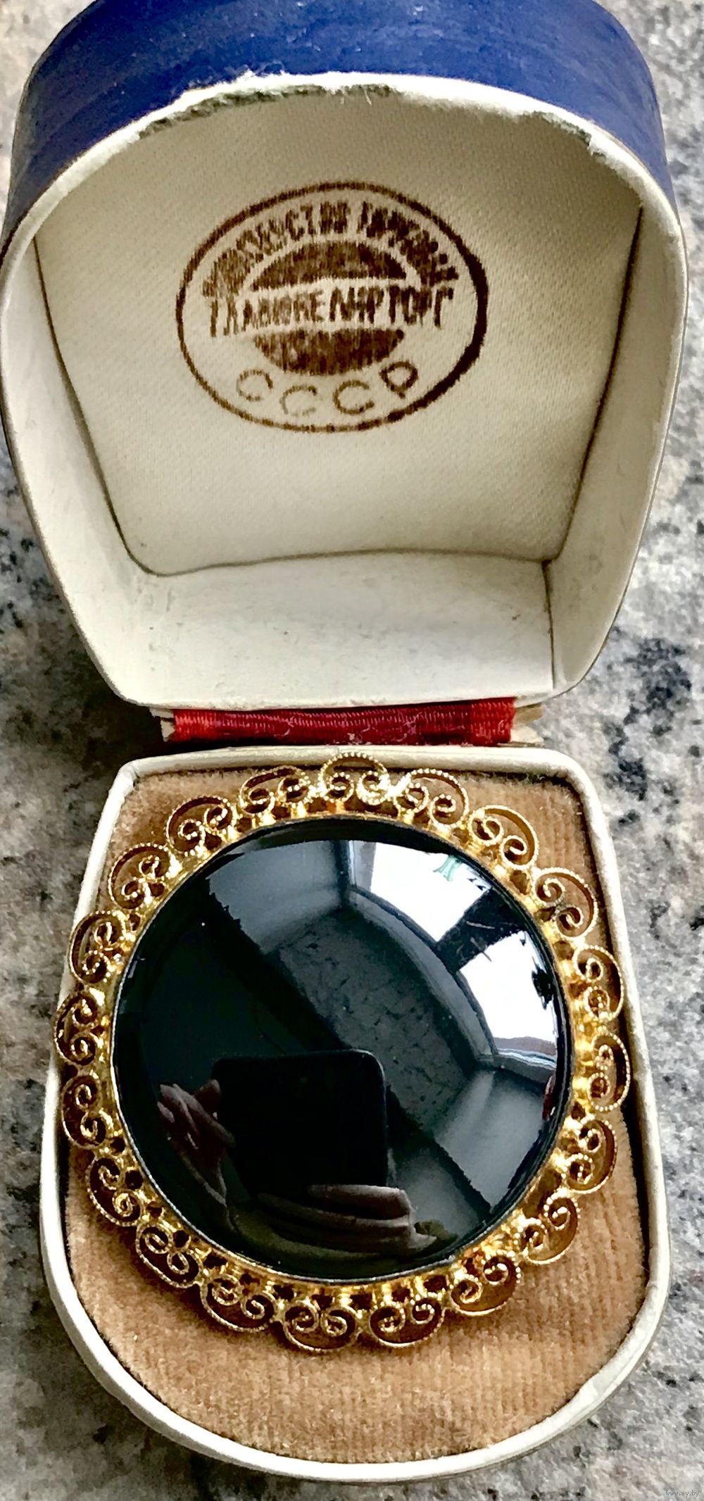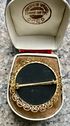 Брошь из Германии середины прошлого века. Основа выполнена из латуни с позолотой, вставка из гематитового стекла. Диаметр броши 4см., диаметр вставки 2,8см. Присутствуют незначительные следы времени. Общее состояние хорошее.