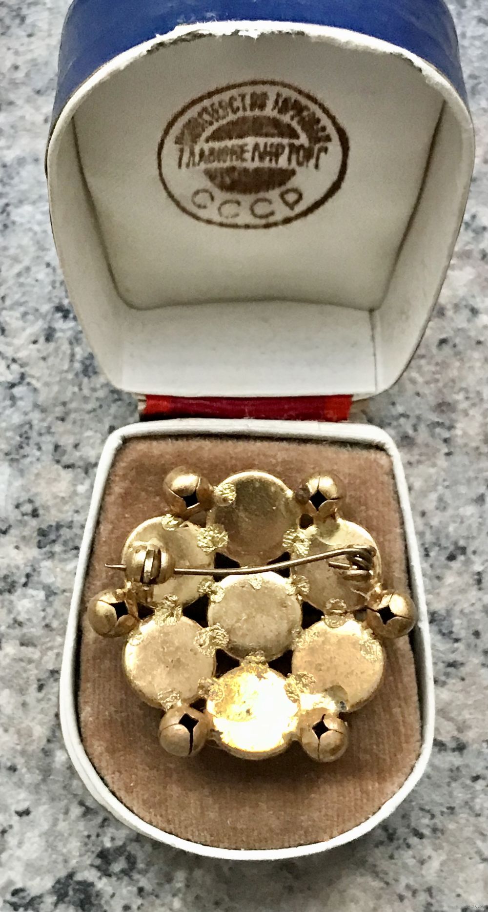 Винтажная брошь с основой из латуни, лицевая сторона украшена кабошонами из стекла чёрного цвета. Диаметр 3,5см. Состояние хорошее.