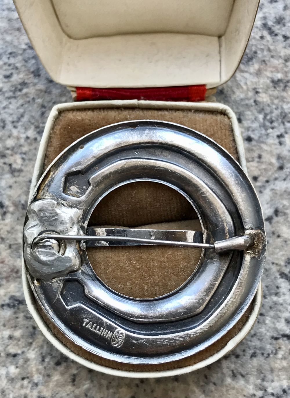 Винтажная брошь сакта (фибула) с основой из мельхиора, изготовлена в Таллинне в 60-70-е гг. На обратной стороне стоит отметка Tallinn. Был ремонт застёжки. Диаметр броши 4см.