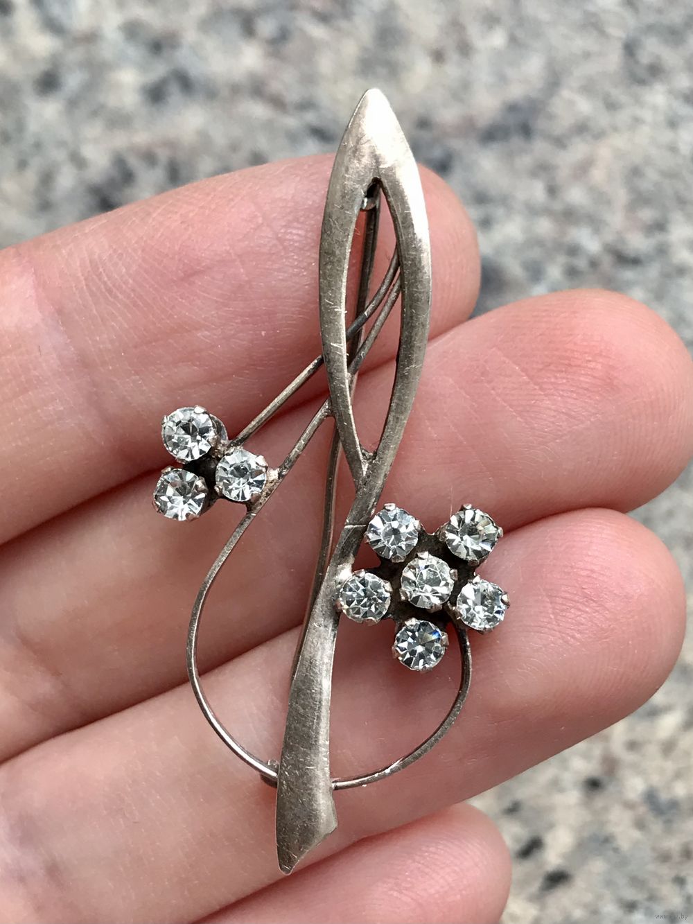 Брошь из серебра 875 пр.(звезда) с позолотой (позолота имеет розоватый оттенок) изготовлена в 1961г. на Подольской ювелирной фабрике (именник ФП1), вставки из стекла. Длина броши 4,6см., для своего возраста состояние хорошее.