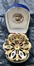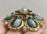Крупная винтажная брошь с основой из металла золотого тона, лицевая сторона украшена вставками из художественного стекла и бусинами с покрытием под жемчуг (на бусинах есть сход покрытия, учтено в цене). Диаметр броши 4,9см. Тяжёленькая.