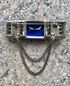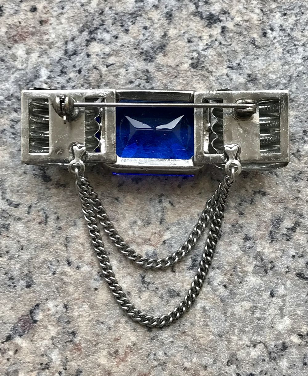 Винтажная брошь с основой из металла серебристого тона, вставка из стекла. Размер броши 5,5х2,6см.(высота без цепочек), размер вставки 1,8х2,4см.На вставке сверху сбоку, где идёт обжатка, на одной грани есть небольшой скольчик, который совсем не виден, когда брошь надета. Общее состояние хорошее.