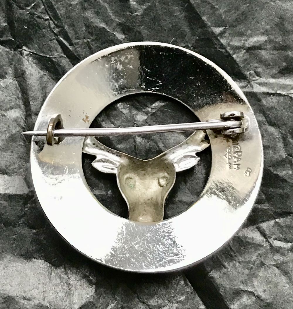 Винтажная брошь с головой оленя от компании MIZPAH, Англия, 1960-70-е гг. Брошь выполнена из металла серебристого тона. Диаметр 3,3см. Маркирована. Состояние хорошее.