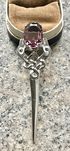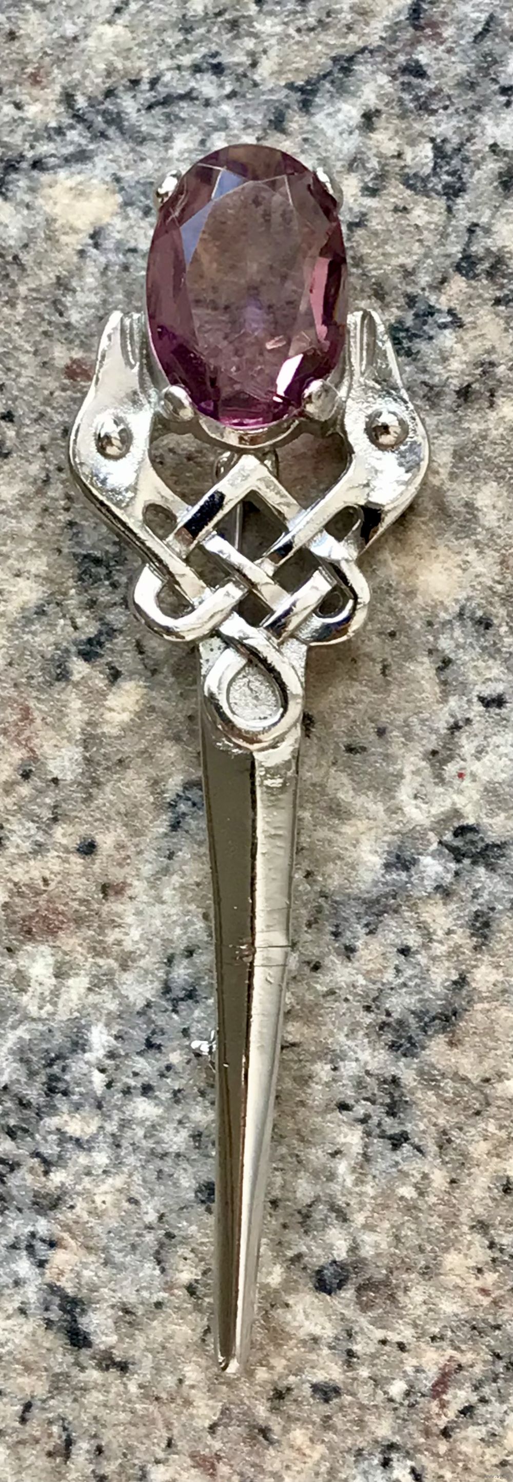 Крупная булавка для килта- килт-пин от компании Carrick Jewellery, 70-е гг., Шотландия. Выполнена из ювелирного сплава серебристого тона и украшена кристаллом из ювелирного стекла, имитирующим аметист. На металле местами присутствуют незначительные царапинки, а на вставке микросколы, которые не заметны невооружённым глазом. Высота броши 8,5см., размер вставки 1,7х1,3см. Украшение маркировано.