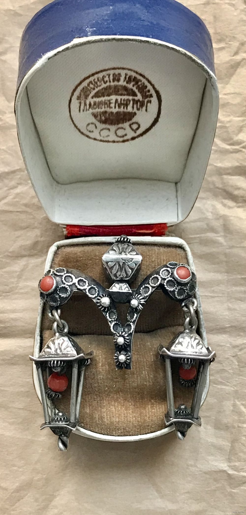 Брошь из серебра 800пр. и вставок из природного коралла. Старый Китай??? Размер 5х4см., вес 12,46гр. Фонарики подвижны. Состояние хорошее.