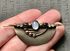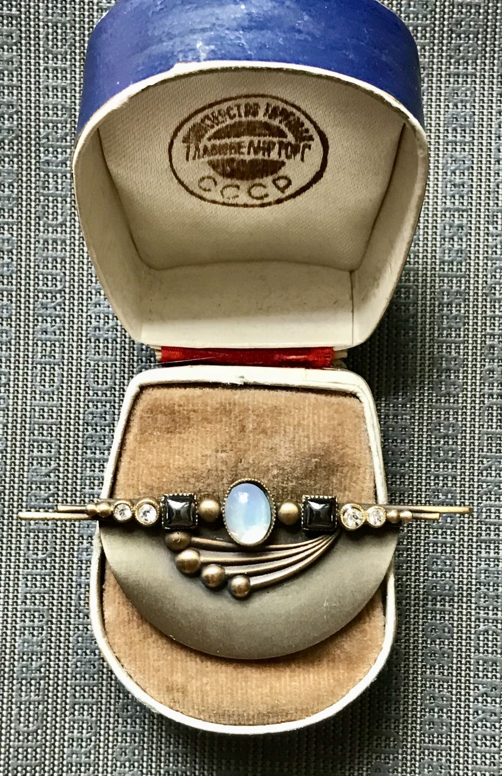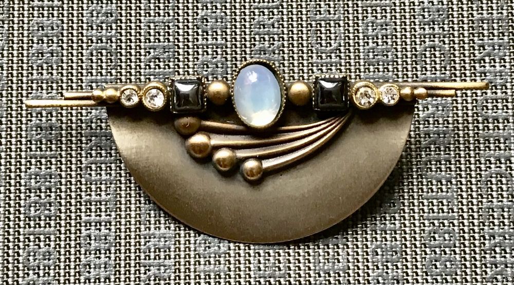 Винтажная брошь в стиле ар-деко. Германия 60-е гг. Сделана из металла под бронзу, вставки из художественного стекла под лунный камень и гематит, а также кристаллы. Размер броши 6х2,5см.