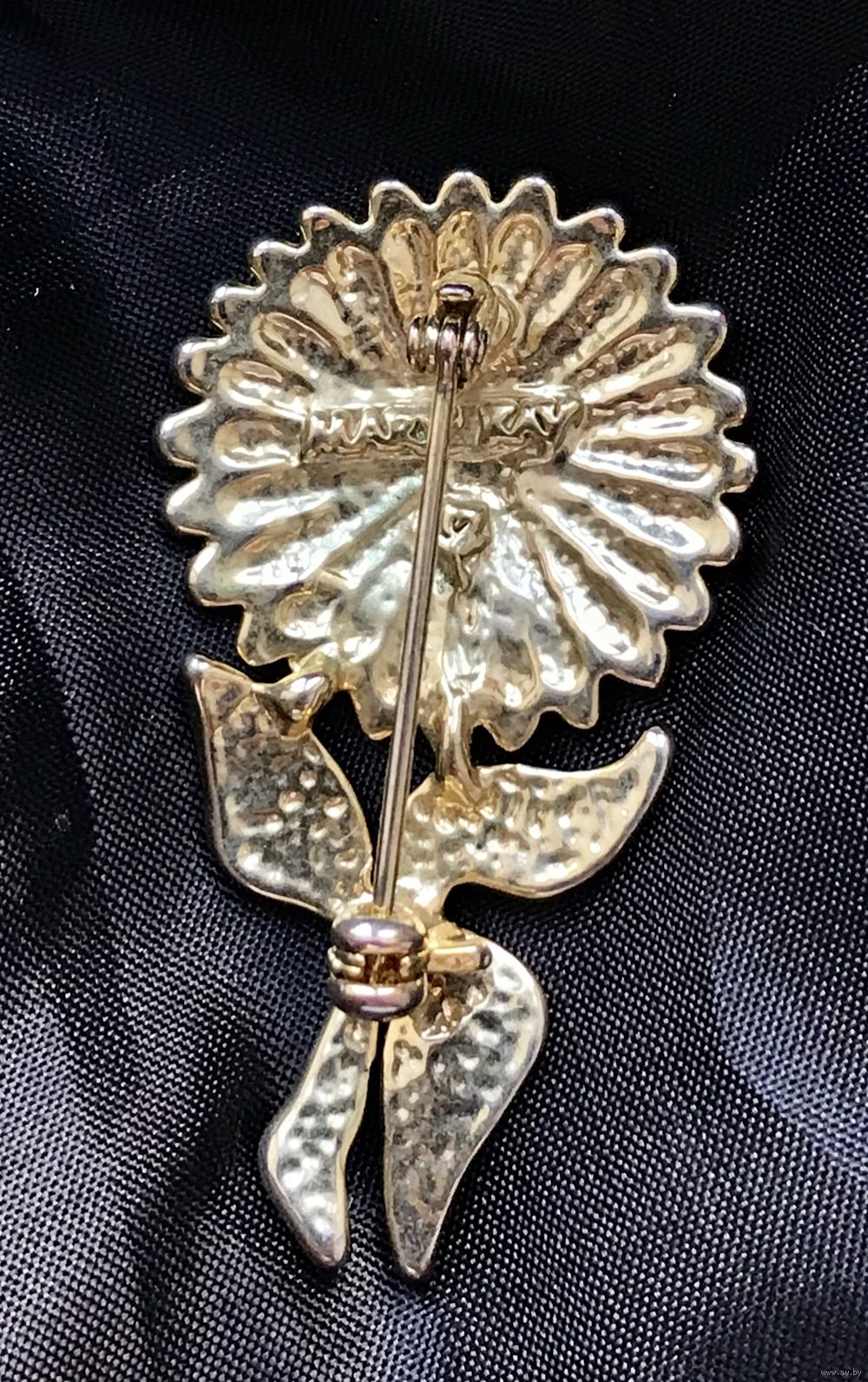 Брошь подсолнух от бренда косметики Mary Kay. Изготовлена из металла с золотистым покрытием. Имеются потёртости. Размер броши 4,5х2,5см. Маркирована.