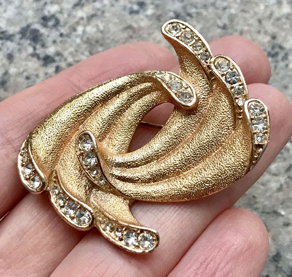 Крупная брошь из металла золотого тона со вставками из кристаллов. Размер 5х4,5см. Не хватает одного самого мелкого кристаллика (в носке не заметно, учтено в цене).