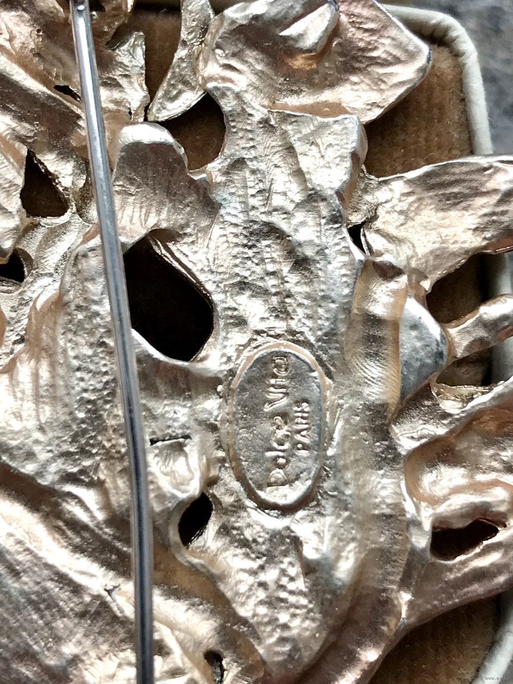 Винтажная (конец 90-х начало 2000-х гг.) брошь известного французского бижутерного бренда Dolce Vita. Брошь из бижутерного сплава цвета розового золота, высота броши 6см., ширина 4см. Состояние хорошее.