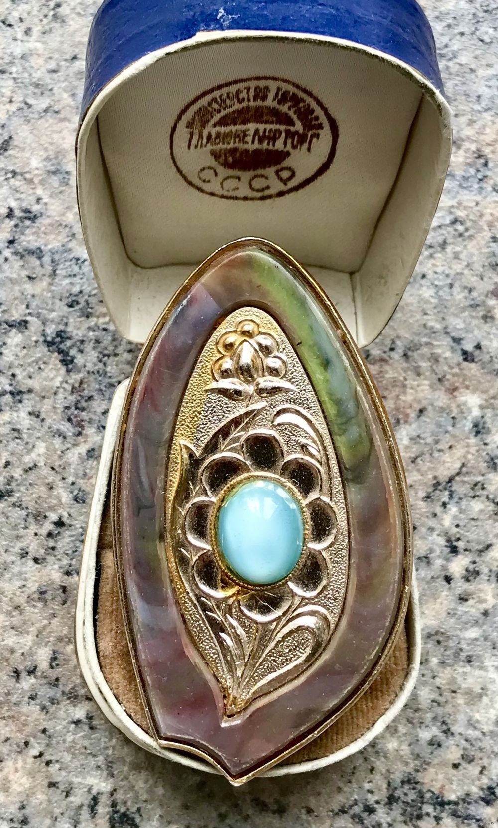 Винтажная бижутерная брошь родом из СССР. Центральная вставка из стекла (в нескольких местах есть следы клея). Брошь довольно крупная, размер 6,5х3,5см., но не тяжёлая.