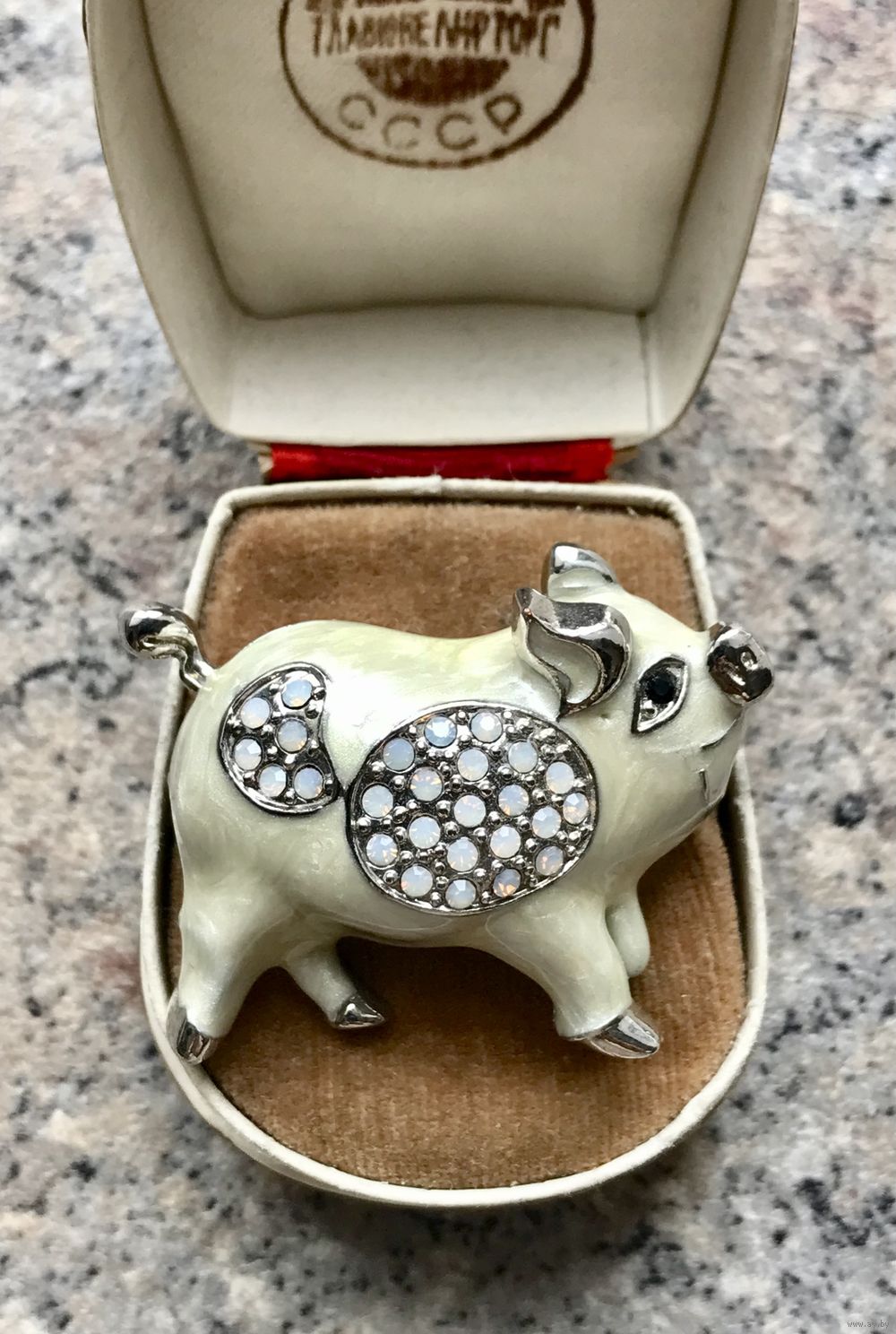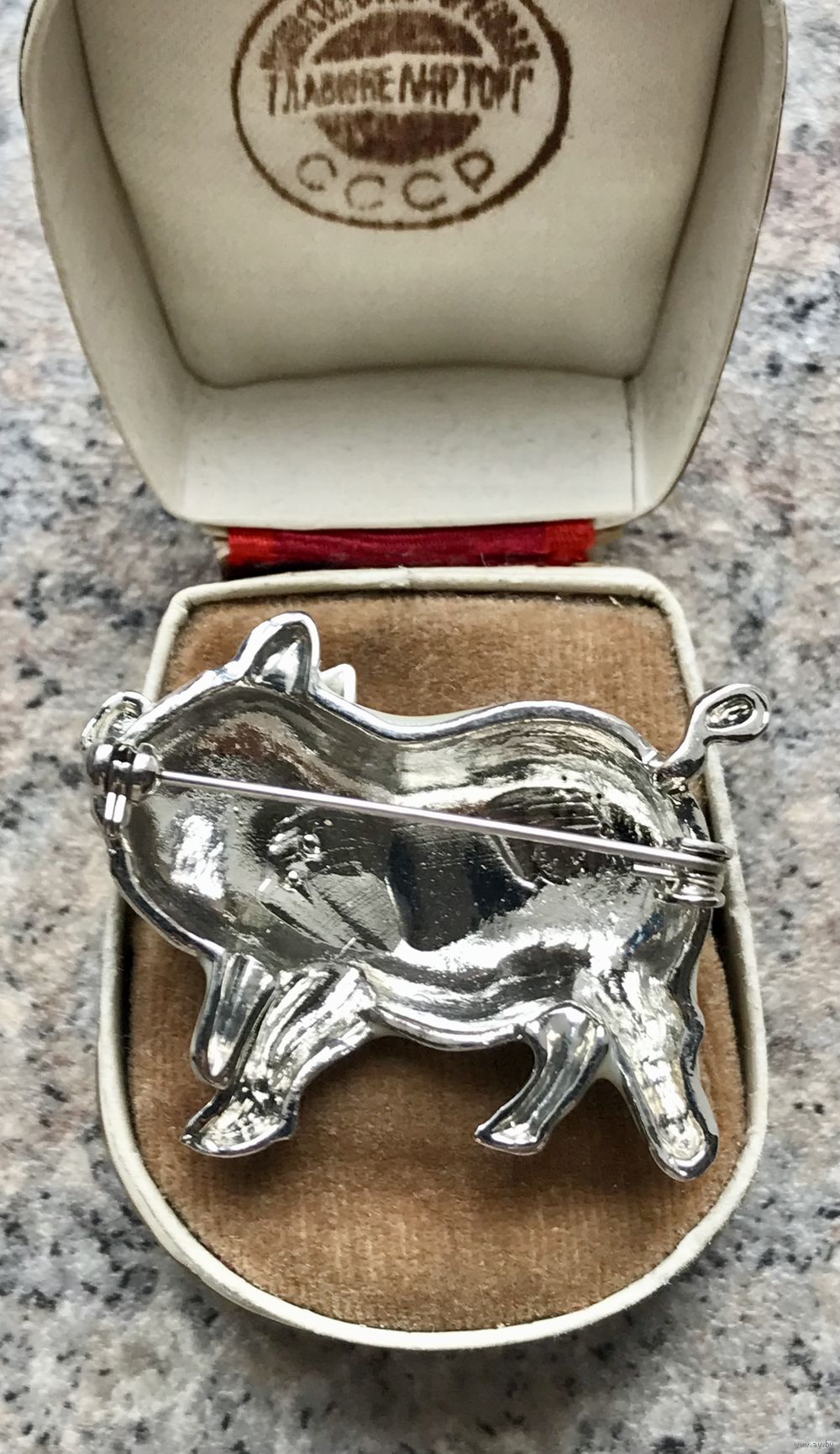 Крупная брошь в виде поросёнка. Основа из металла серебристого тона, на лицевой стороне эмаль, вставки из кристаллов, размер 4х2,5см. Состояние хорошее.